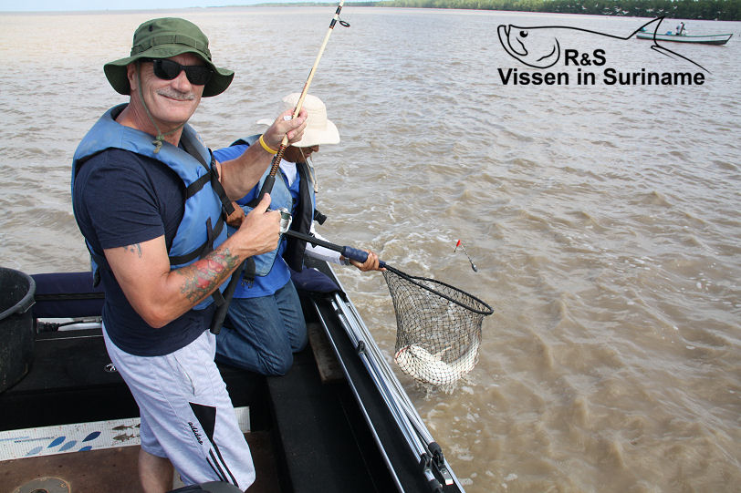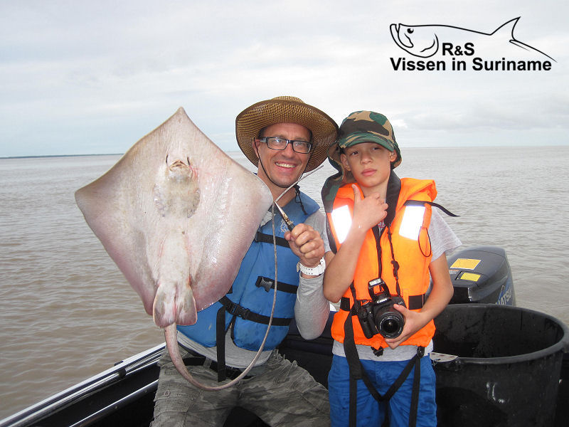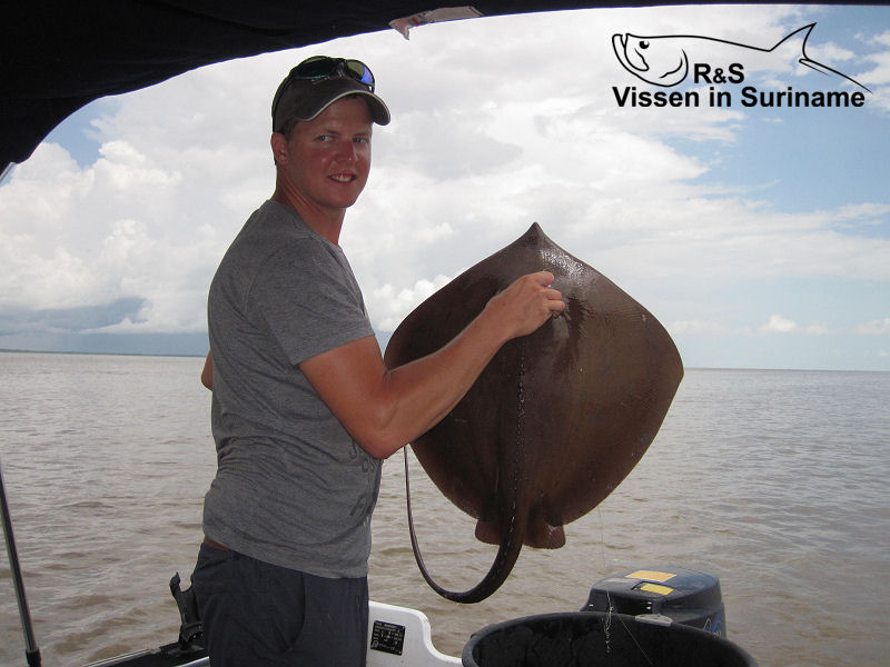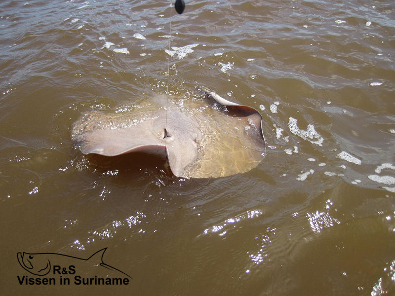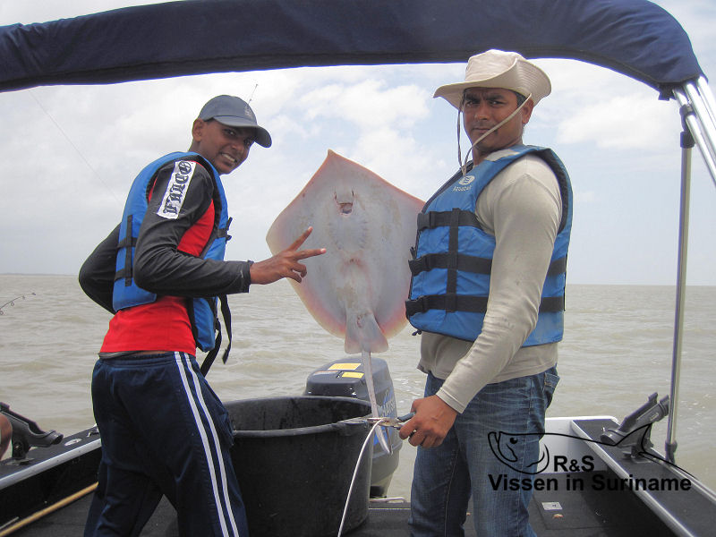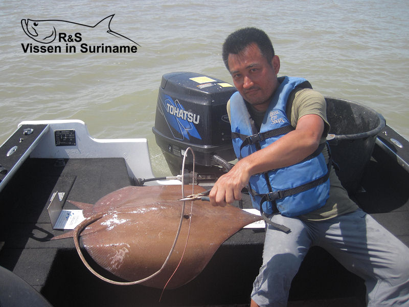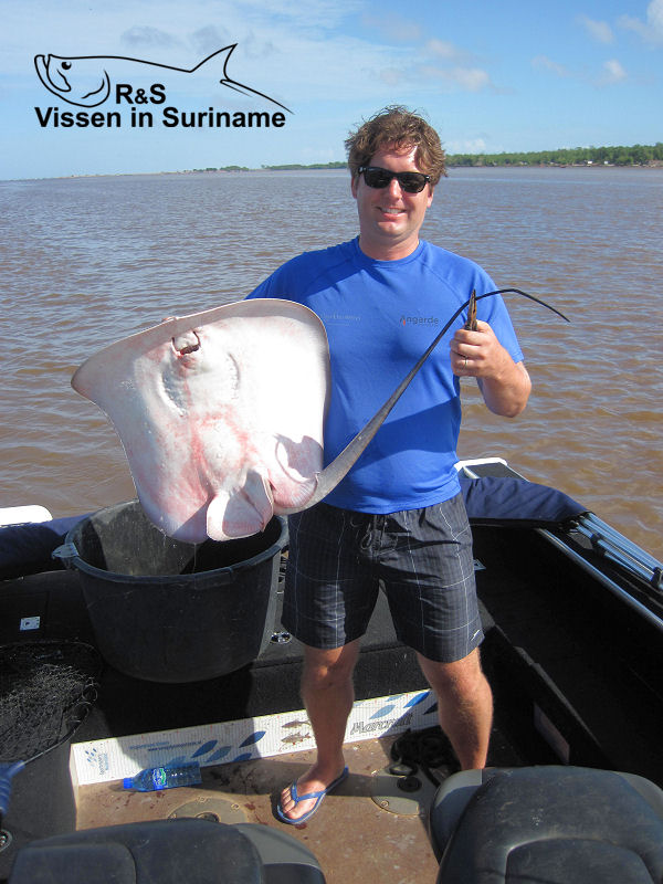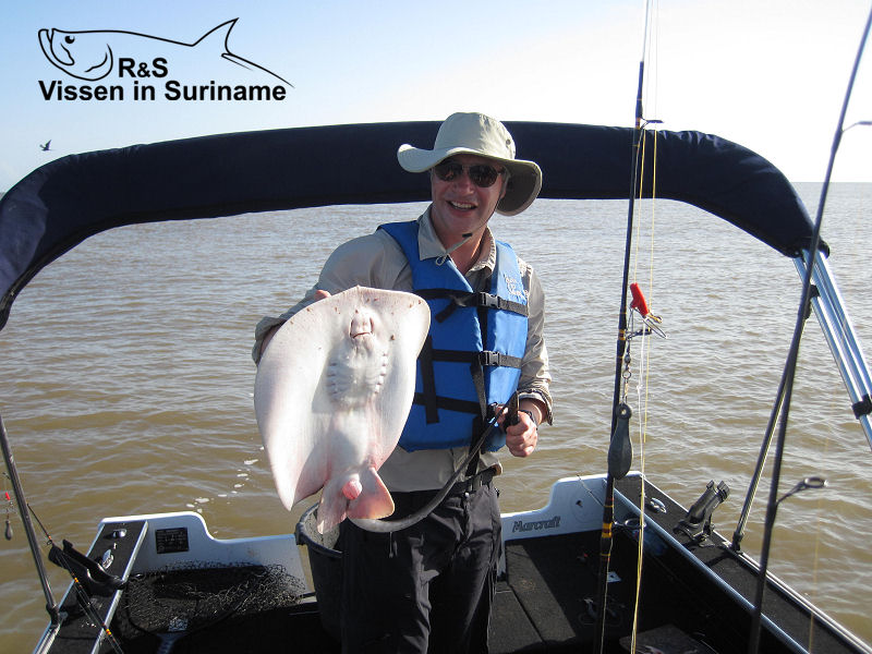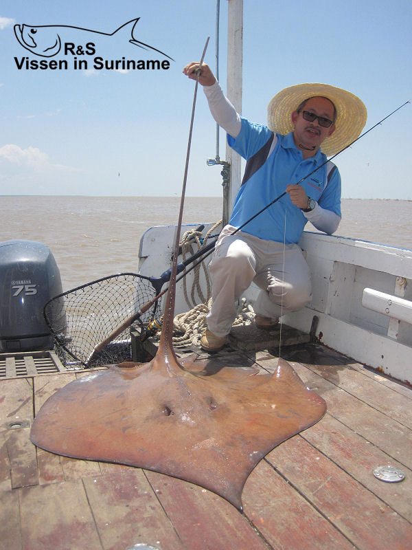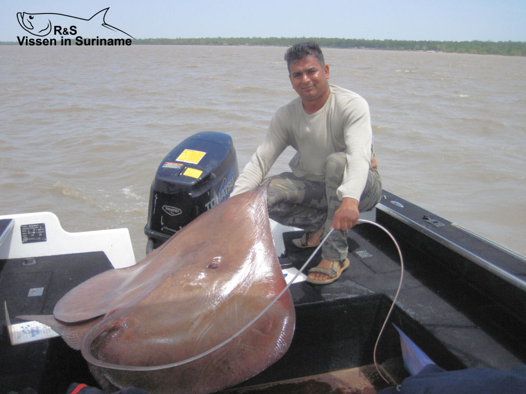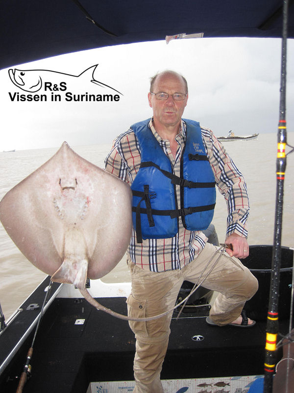 Ger Suijkens is 2 weken met vakantie in Suriname. Uit zijn groep van 10 personen is hij de enige visser. De vakantie zit er bijna op en hij wilt een dag gaan Vissen. Zijn voorkeur gaat uit naar grote Vissen….. met z’n 2-en gaan we naar de monding. Omdat de helling bij “DOC 204” in onderhoud is, vertrekken we vanaf Durga Marina. Dit betekend extra reistijd maar we passeren eyecatchers als Bosche brug, de Goslar, Waterkant, Fort Zeelandia, Torarica enz. We varen direct door naar de atlantischeoceaanzijde. Vers aas wordt gehaald bij een lokale fuik visser. Er staat een vervelende golfslag maar we wagen het er op. En het duurt niet lang of Ger vangt een Kodokoe (Arius Quidriscutis). Niet lang daarna volgt een grijze Katvis (Arius SP). De deining wordt niet beter. En ik besluit naar binnen te gaan. Voor het vissersdorpje Pomona leggen we aan bij een fuik visser. Hier vangt Ger zijn 1ste rog (Dasyatidae spp.). Met een gewicht van 7KG is het een mooie. Op een gegeven moment hebben we een aanbeet op de 1ste hengel. Terwijl Ger die oppakt volgt een run op de ander. Nu staan we beide met een gebogen hengel in onze hand. Er is geen houden aan. We winnen 2 en verliezen 10 meter lijn. Als we de vissen eindelijk dicht bij de boot hebben gebeurt waarvoor ik vreesde de vissen kruisen de lijnen en Ger krijgt lijnbreuk… zonde.... ik dril rustig verder maar het duurt te lang en ook bij mij volgt lijnbreuk.. Nadat we nog een aanbeet verspelen door lijnbreuk schakelen we over op heavy materiaal en stalen onderlijnen. Ger doet een grote aasvis aan de haak en gooit uit. Binnen notime wordt het aas gegrepen. Het heavy materiaal en stalen onderlijn doen hun werk. Na een dril van ruim 40minuten, landt Ger een mega ROG… 110CM schild doorsnede.. een nieuw record aan boord….