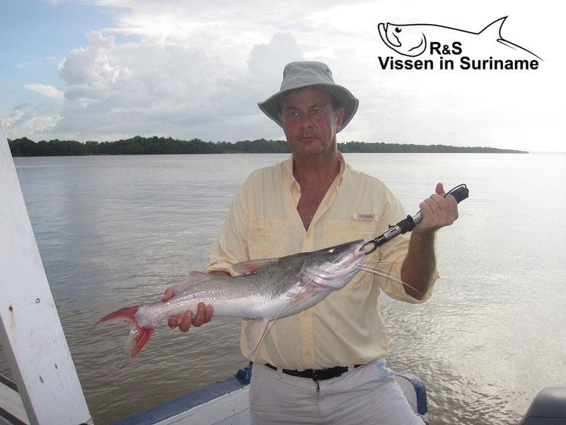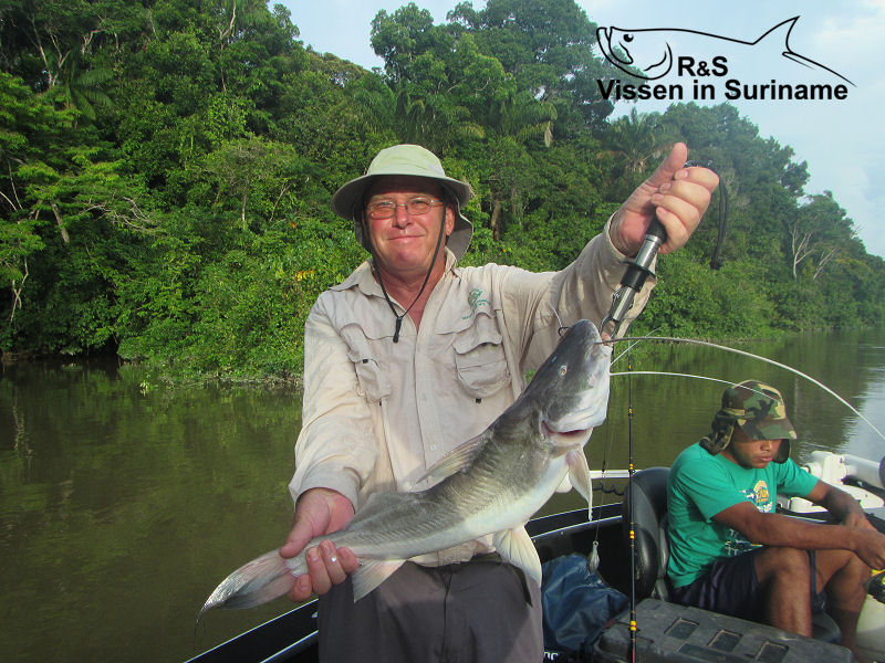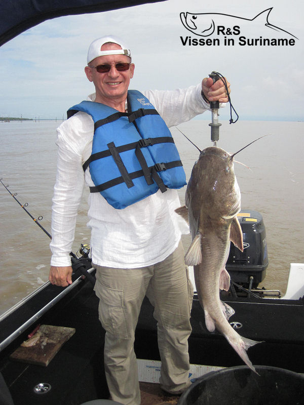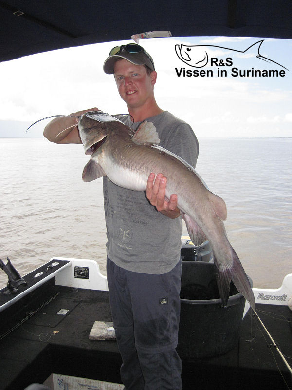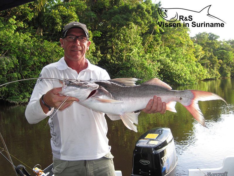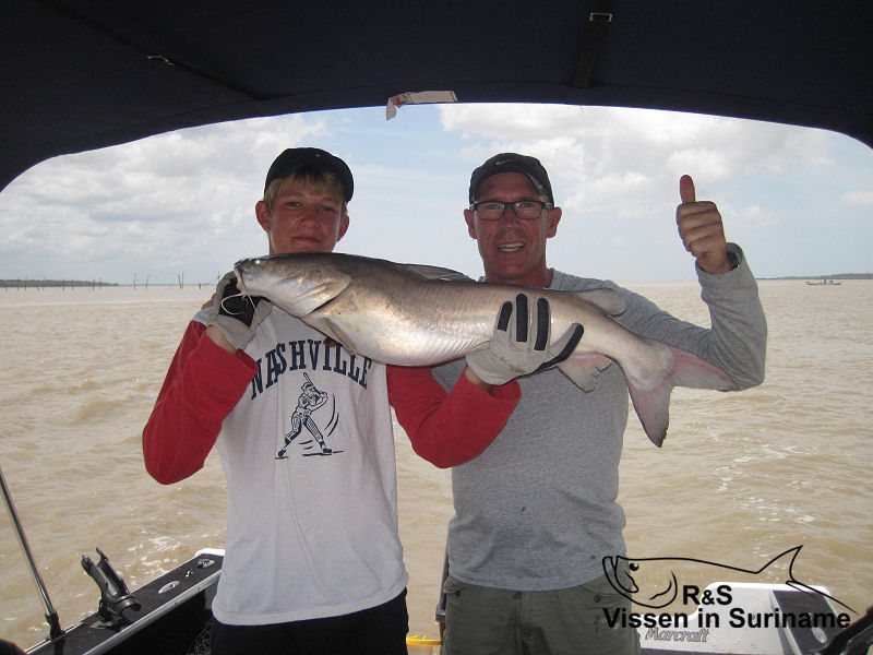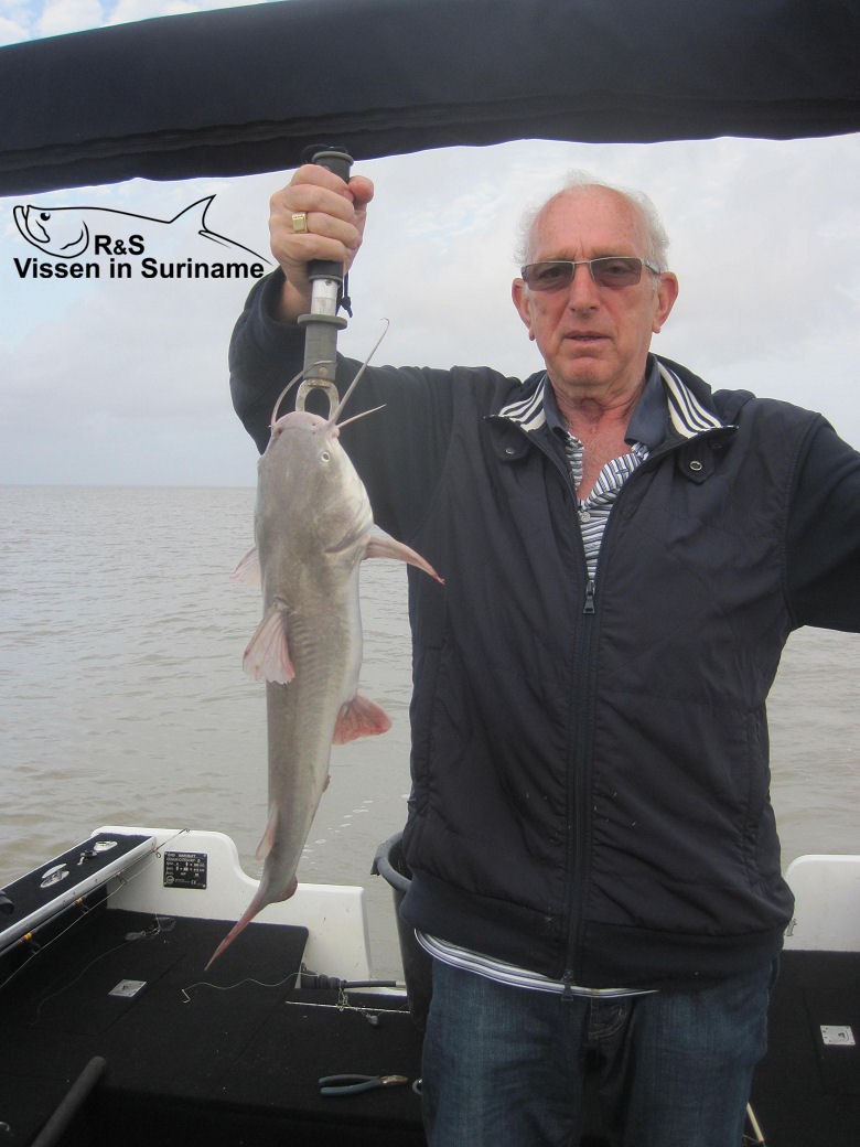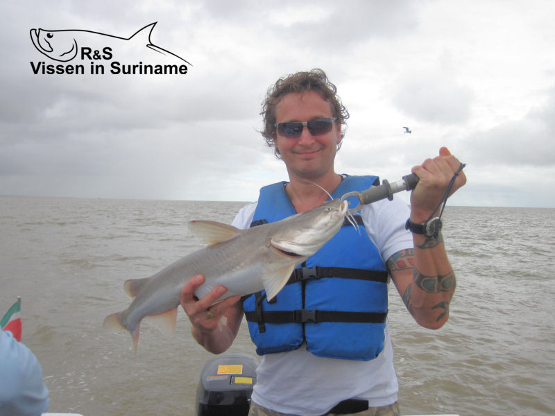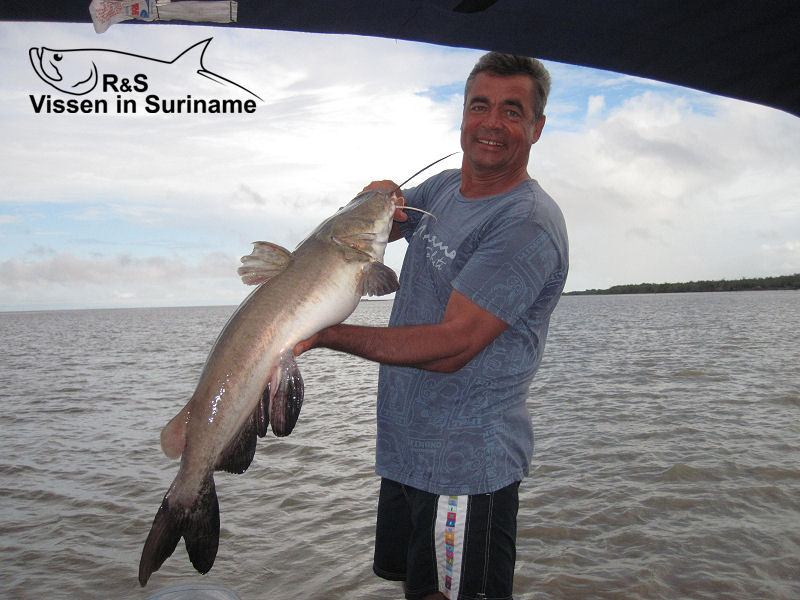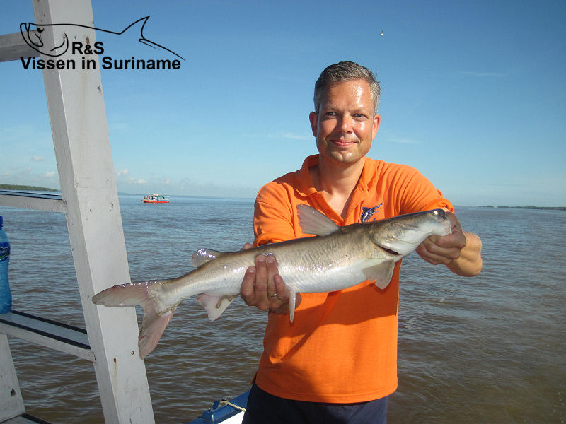 Ger Suijkens is 2 weken met vakantie in Suriname. Uit zijn groep van 10 personen is hij de enige visser. De vakantie zit er bijna op en hij wilt een dag gaan Vissen. Zijn voorkeur gaat uit naar grote Vissen….. met z’n 2-en gaan we naar de monding. Omdat de helling bij “DOC 204” in onderhoud is, vertrekken we vanaf Durga Marina. Dit betekend extra reistijd maar we passeren eyecatchers als Bosche brug, de Goslar, Waterkant, Fort Zeelandia, Torarica enz. We varen direct door naar de atlantischeoceaanzijde. Vers aas wordt gehaald bij een lokale fuik visser. Er staat een vervelende golfslag maar we wagen het er op. En het duurt niet lang of Ger vangt een Kodokoe (Arius Quidriscutis). Niet lang daarna volgt een grijze Katvis (Arius SP). De deining wordt niet beter. En ik besluit naar binnen te gaan. Voor het vissersdorpje Pomona leggen we aan bij een fuik visser. Hier vangt Ger zijn 1ste rog (Dasyatidae spp.). Met een gewicht van 7KG is het een mooie. Op een gegeven moment hebben we een aanbeet op de 1ste hengel. Terwijl Ger die oppakt volgt een run op de ander. Nu staan we beide met een gebogen hengel in onze hand. Er is geen houden aan. We winnen 2 en verliezen 10 meter lijn. Als we de vissen eindelijk dicht bij de boot hebben gebeurt waarvoor ik vreesde de vissen kruisen de lijnen en Ger krijgt lijnbreuk… zonde.... ik dril rustig verder maar het duurt te lang en ook bij mij volgt lijnbreuk.. Nadat we nog een aanbeet verspelen door lijnbreuk schakelen we over op heavy materiaal en stalen onderlijnen. Ger doet een grote aasvis aan de haak en gooit uit. Binnen notime wordt het aas gegrepen. Het heavy materiaal en stalen onderlijn doen hun werk. Na een dril van ruim 40minuten, landt Ger een mega ROG… 110CM schild doorsnede.. een nieuw record aan boord….