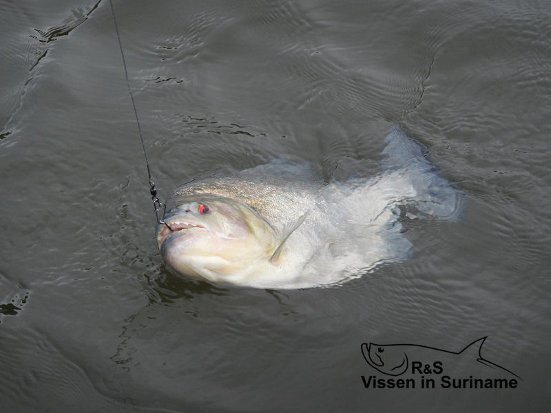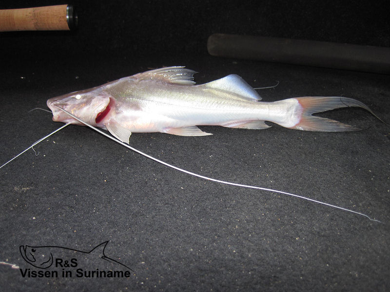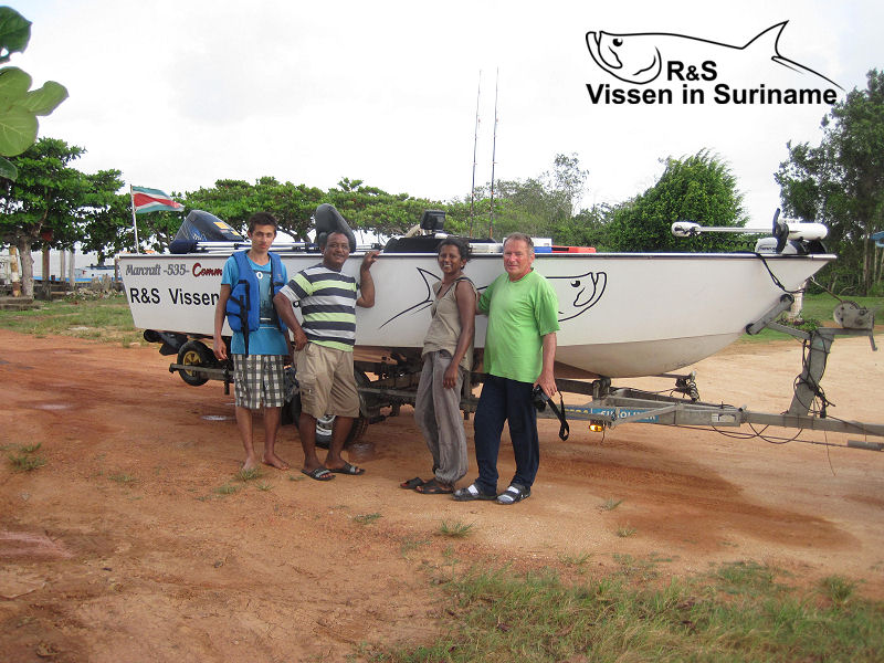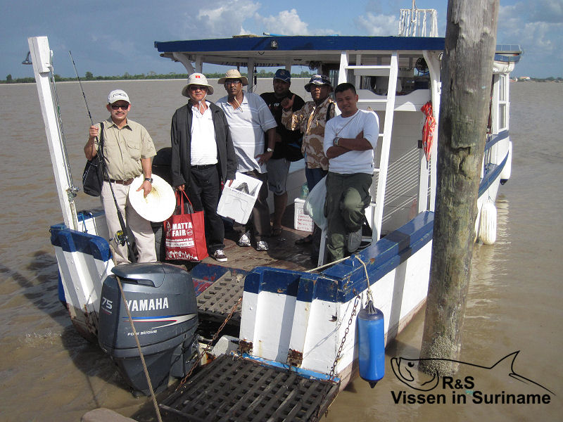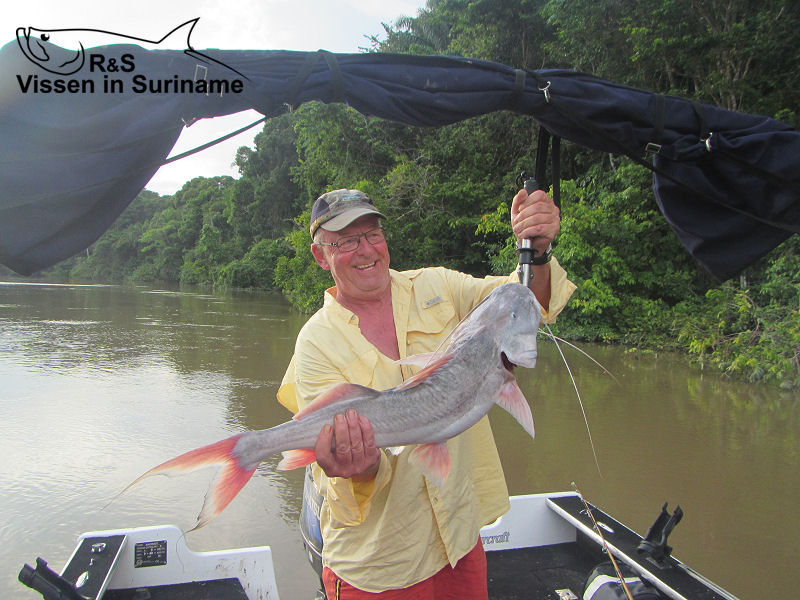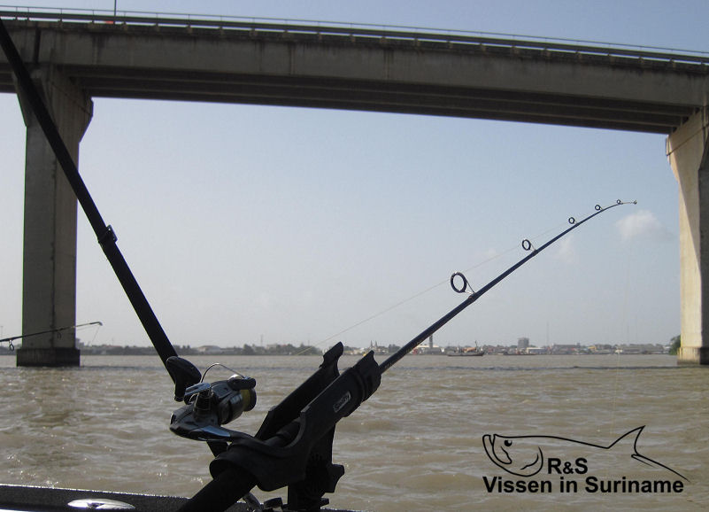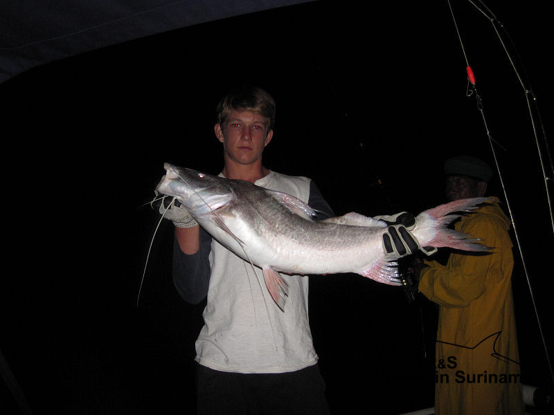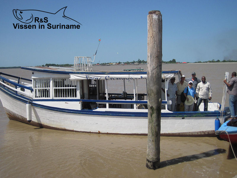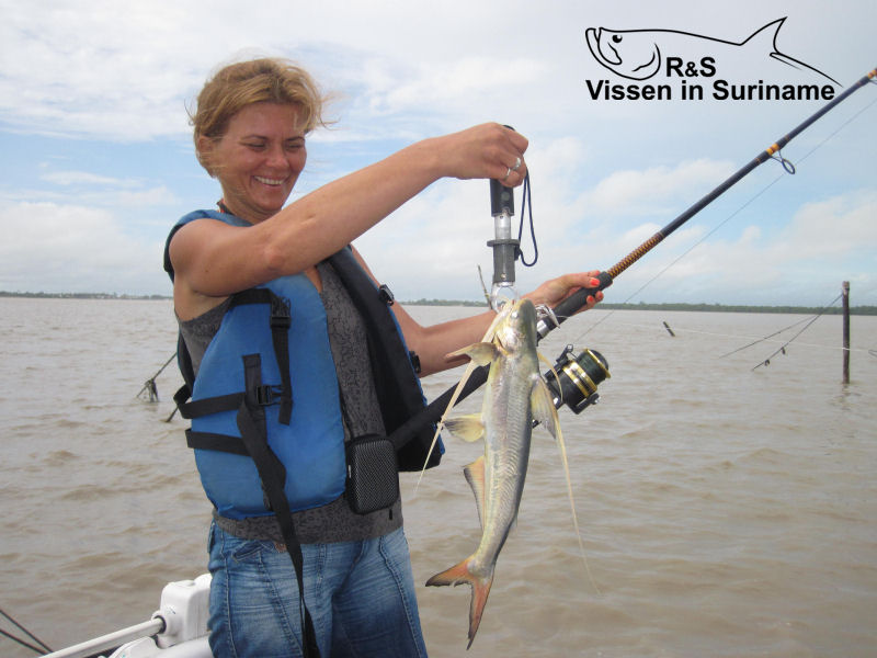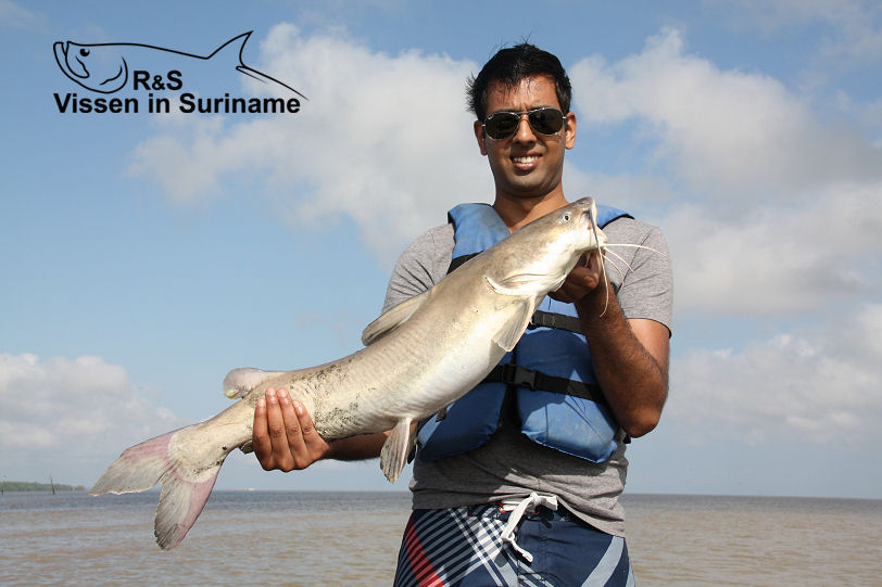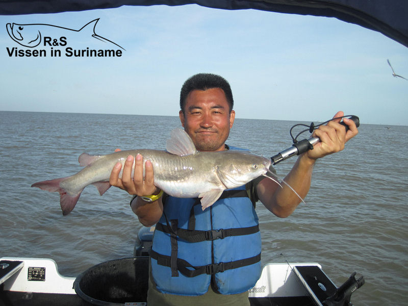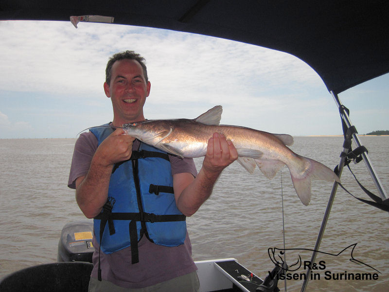 Ger Suijkens is 2 weken met vakantie in Suriname. Uit zijn groep van 10 personen is hij de enige visser. De vakantie zit er bijna op en hij wilt een dag gaan Vissen. Zijn voorkeur gaat uit naar grote Vissen….. met z’n 2-en gaan we naar de monding. Omdat de helling bij “DOC 204” in onderhoud is, vertrekken we vanaf Durga Marina. Dit betekend extra reistijd maar we passeren eyecatchers als Bosche brug, de Goslar, Waterkant, Fort Zeelandia, Torarica enz. We varen direct door naar de atlantischeoceaanzijde. Vers aas wordt gehaald bij een lokale fuik visser. Er staat een vervelende golfslag maar we wagen het er op. En het duurt niet lang of Ger vangt een Kodokoe (Arius Quidriscutis). Niet lang daarna volgt een grijze Katvis (Arius SP). De deining wordt niet beter. En ik besluit naar binnen te gaan. Voor het vissersdorpje Pomona leggen we aan bij een fuik visser. Hier vangt Ger zijn 1ste rog (Dasyatidae spp.). Met een gewicht van 7KG is het een mooie. Op een gegeven moment hebben we een aanbeet op de 1ste hengel. Terwijl Ger die oppakt volgt een run op de ander. Nu staan we beide met een gebogen hengel in onze hand. Er is geen houden aan. We winnen 2 en verliezen 10 meter lijn. Als we de vissen eindelijk dicht bij de boot hebben gebeurt waarvoor ik vreesde de vissen kruisen de lijnen en Ger krijgt lijnbreuk… zonde.... ik dril rustig verder maar het duurt te lang en ook bij mij volgt lijnbreuk.. Nadat we nog een aanbeet verspelen door lijnbreuk schakelen we over op heavy materiaal en stalen onderlijnen. Ger doet een grote aasvis aan de haak en gooit uit. Binnen notime wordt het aas gegrepen. Het heavy materiaal en stalen onderlijn doen hun werk. Na een dril van ruim 40minuten, landt Ger een mega ROG… 110CM schild doorsnede.. een nieuw record aan boord….