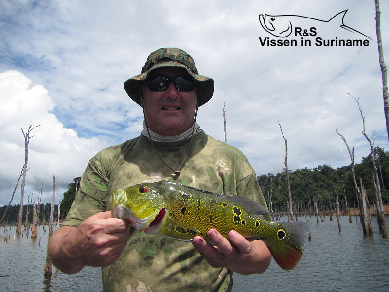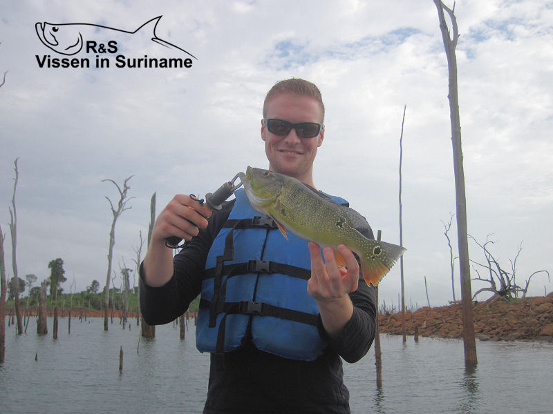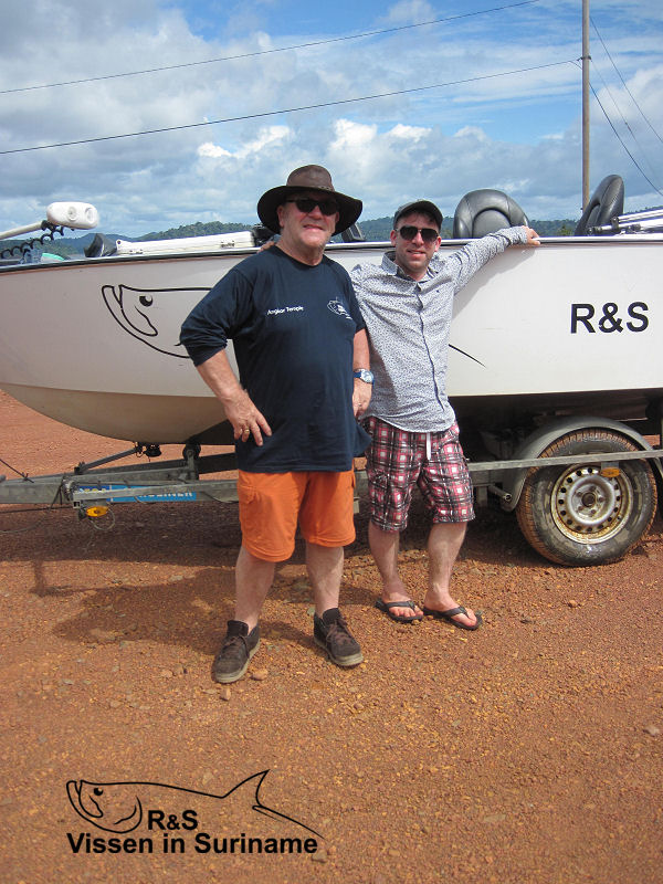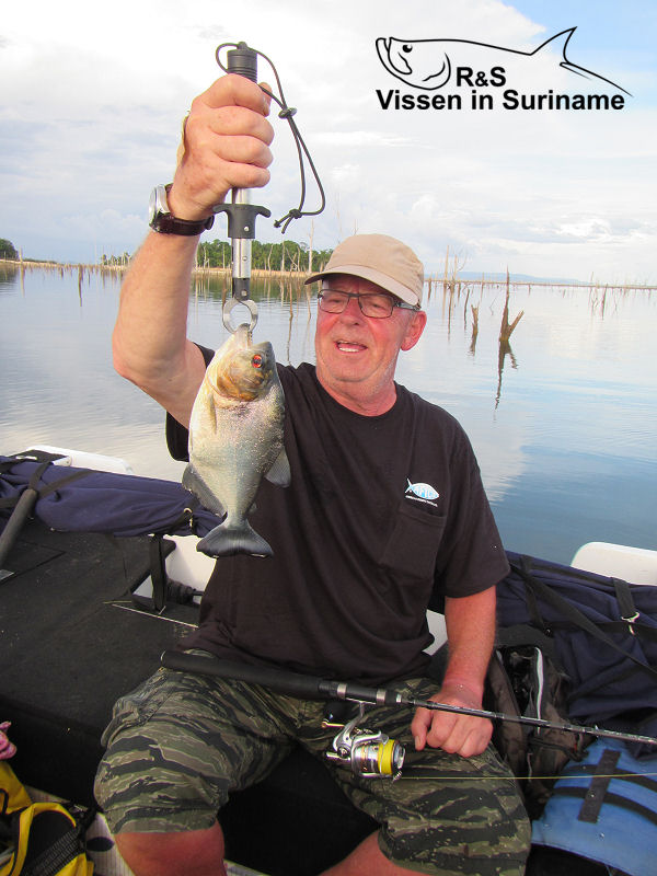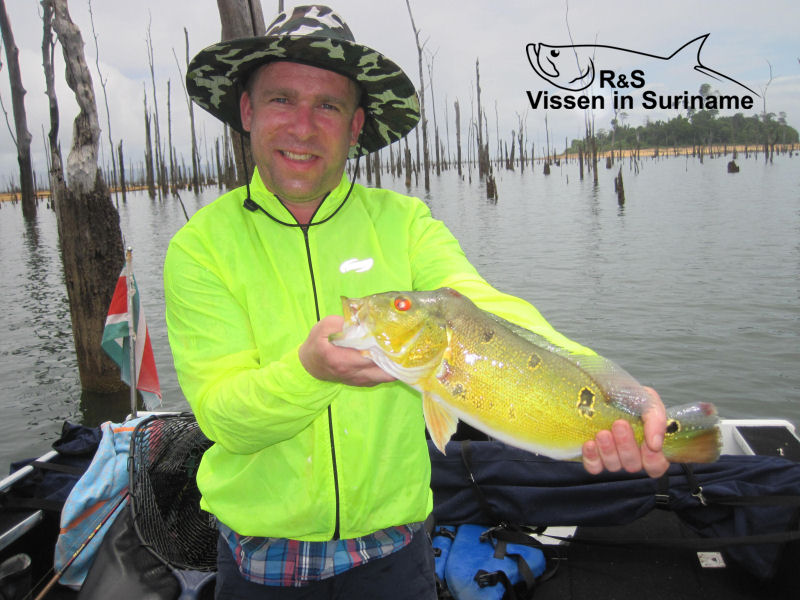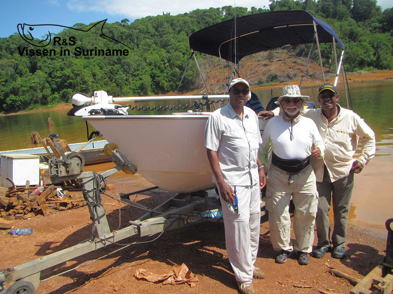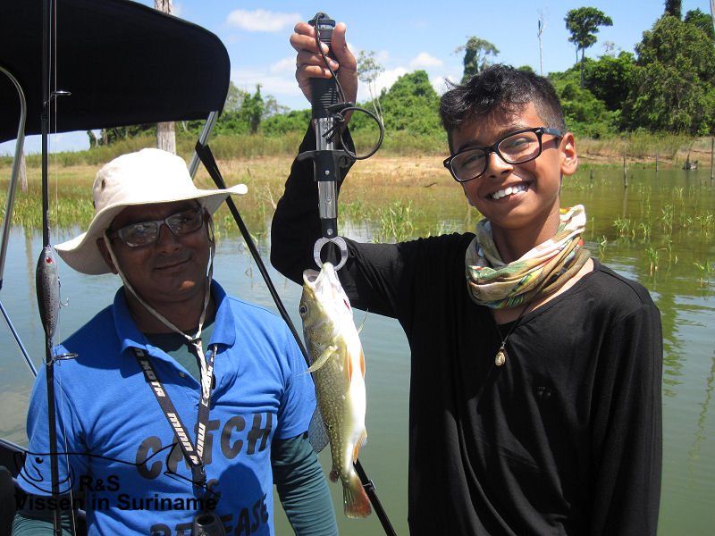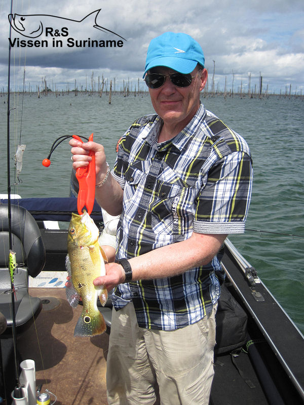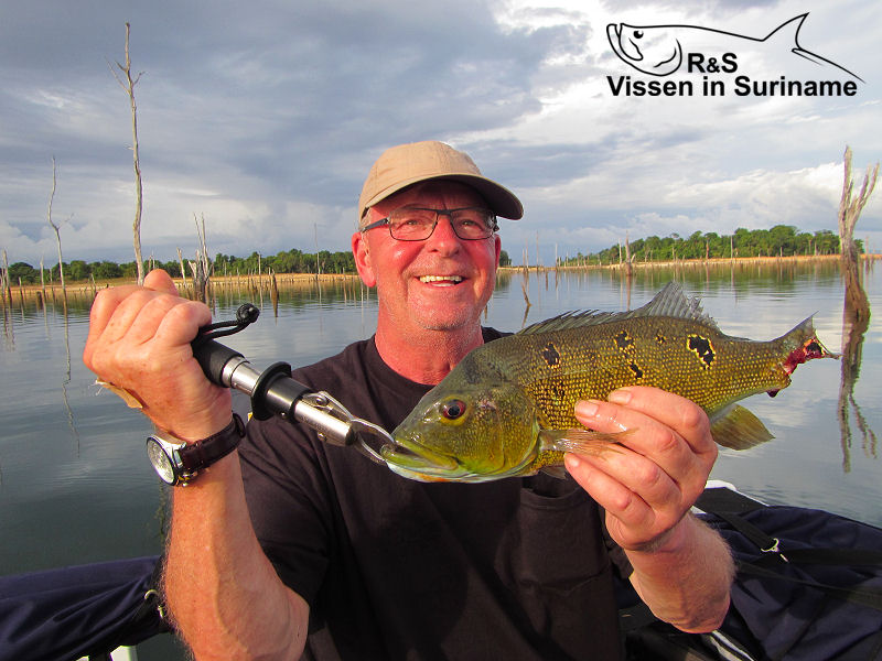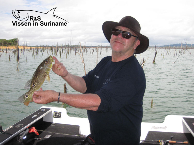 Ab de Jong en Peter Naarden plannen ver vooruit. Reeds een half jaar van de voren doen ze de reservering voor 3 dagen vissen op het Stuwmeer met overnachting op basic resort "Libidawai".. Het zijn ervaren vissers die over de hele wereld gevist hebben. Zowel met de vliegenlat als met de spinning reels. Belangrijk detail. Ab en Peter zijn 65+ en een stabiele visboot vinden ze erg belangrijk. Bij “R&S Vissen In Suriname” met de “Commander van Marcraft” zijn ze aan het juiste adres. Op dag 1 vertrekken we om 04.30 vanuit Paramaribo. Na het traileren zetten we koers richting Libi Da Wai. We gaan onze bagage afzetten en vervolgens vissen. Het blijkt allemaal makkelijker gezegd dan gedaan. Het water is zo laag dat het resort met de grootste moeite te bereiken is. Vorig jaar bij het eiland, legde ik mijn boot vast aan een boom en toen had ik nog 2 meter water onder de boot. Dezelfde boom staat nu op het droge z’n 20 meter vanaf de waterlijn.... eenmaal uitgeladen gaan we vissen. Het blijkt een taaie visdag te worden. Zowel in de ochtend als in de middag verraden de vissen zich niet. Het wordt veel werpen, ondertussen drift ik de boot langs de interessante stekken. En het heeft resultaat. Er komt Tukunari aan boord. Een midden maatje. De Tukunari is niet blij en springt zo uit de handen van Ab.