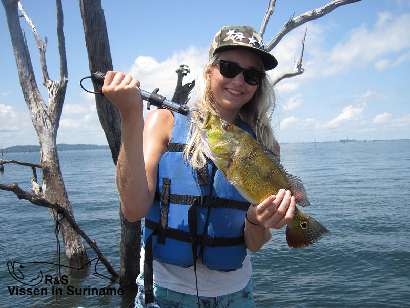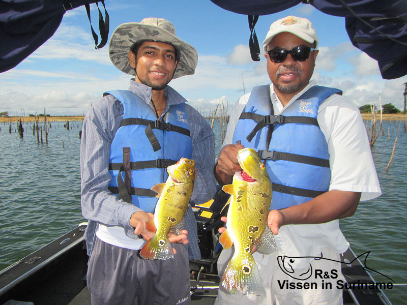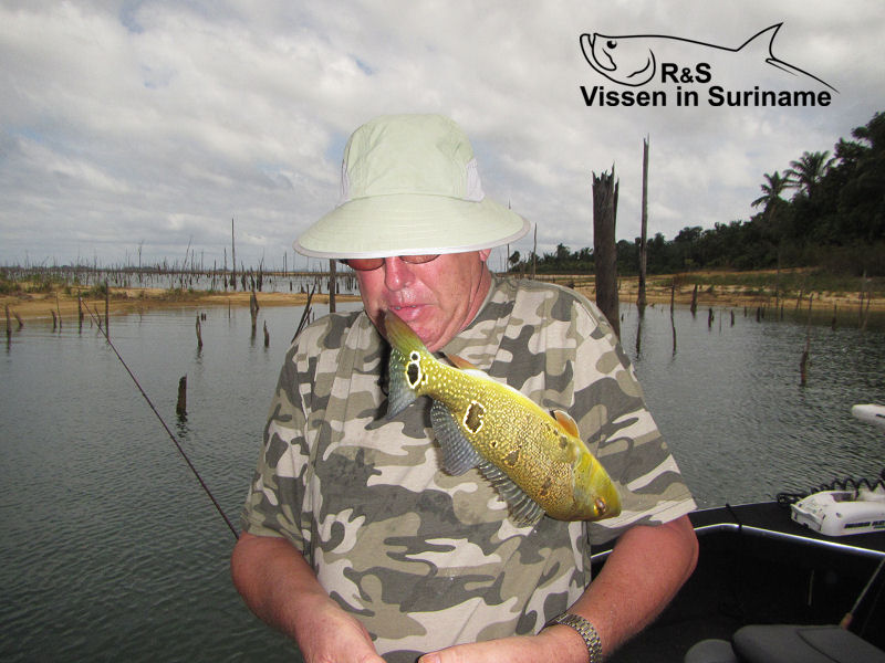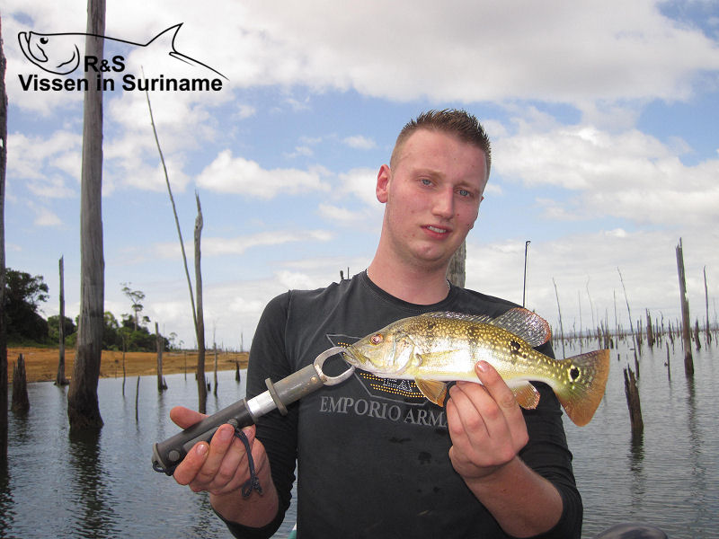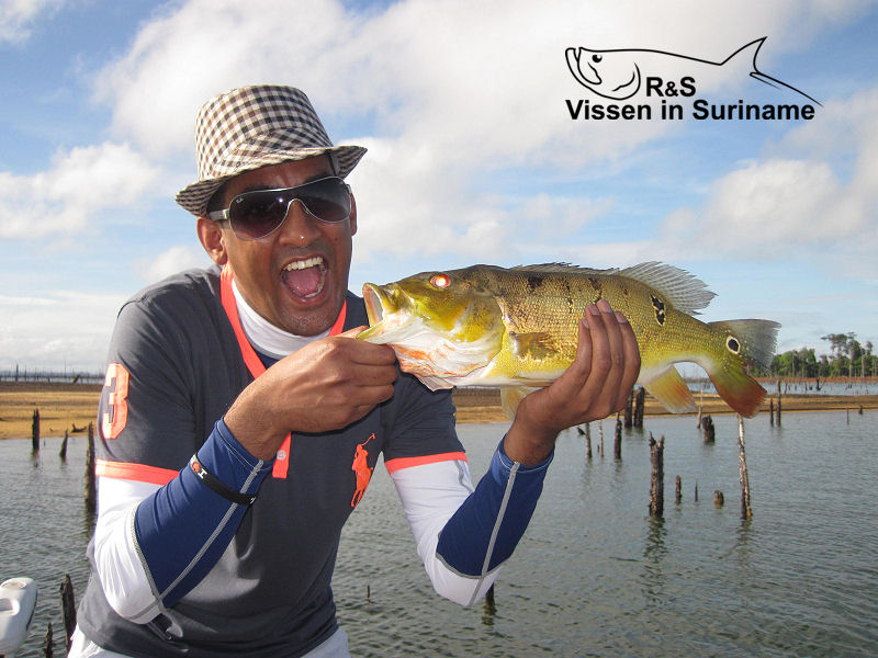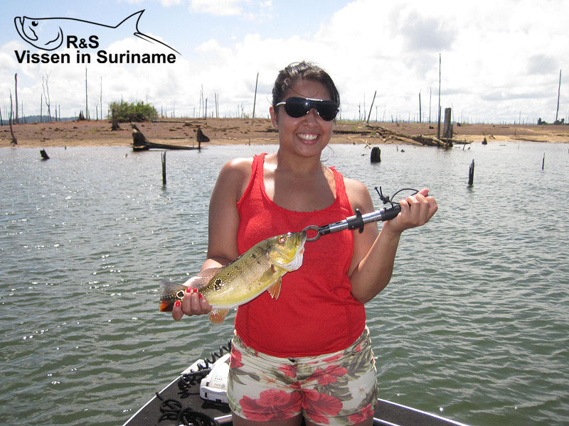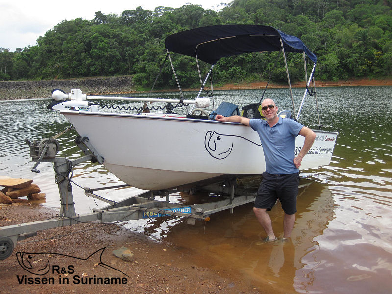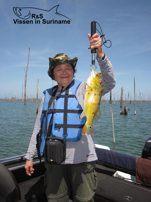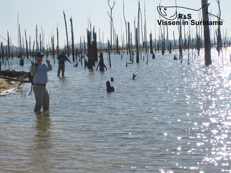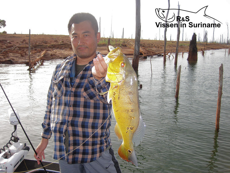 Ab de Jong en Peter Naarden plannen ver vooruit. Reeds een half jaar van de voren doen ze de reservering voor 3 dagen vissen op het Stuwmeer met overnachting op basic resort "Libidawai".. Het zijn ervaren vissers die over de hele wereld gevist hebben. Zowel met de vliegenlat als met de spinning reels. Belangrijk detail. Ab en Peter zijn 65+ en een stabiele visboot vinden ze erg belangrijk. Bij “R&S Vissen In Suriname” met de “Commander van Marcraft” zijn ze aan het juiste adres. Op dag 1 vertrekken we om 04.30 vanuit Paramaribo. Na het traileren zetten we koers richting Libi Da Wai. We gaan onze bagage afzetten en vervolgens vissen. Het blijkt allemaal makkelijker gezegd dan gedaan. Het water is zo laag dat het resort met de grootste moeite te bereiken is. Vorig jaar bij het eiland, legde ik mijn boot vast aan een boom en toen had ik nog 2 meter water onder de boot. Dezelfde boom staat nu op het droge z’n 20 meter vanaf de waterlijn.... eenmaal uitgeladen gaan we vissen. Het blijkt een taaie visdag te worden. Zowel in de ochtend als in de middag verraden de vissen zich niet. Het wordt veel werpen, ondertussen drift ik de boot langs de interessante stekken. En het heeft resultaat. Er komt Tukunari aan boord. Een midden maatje. De Tukunari is niet blij en springt zo uit de handen van Ab.