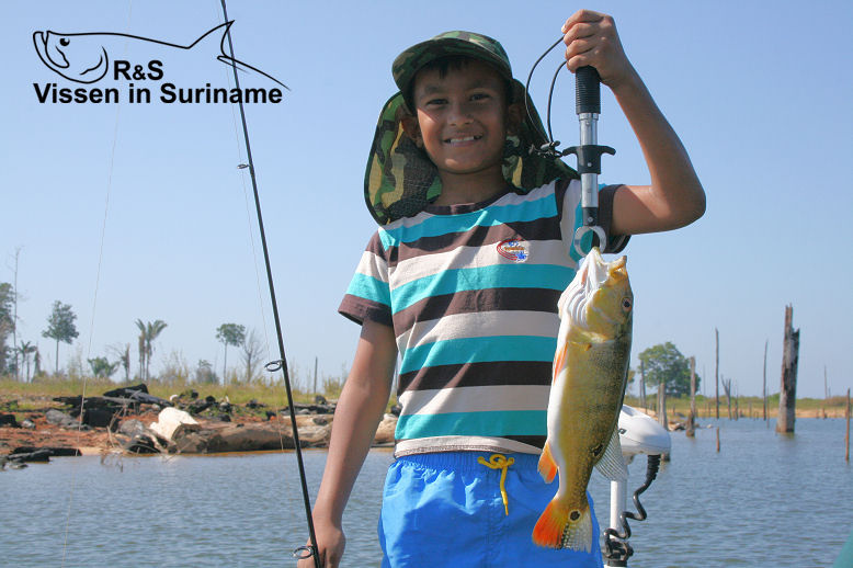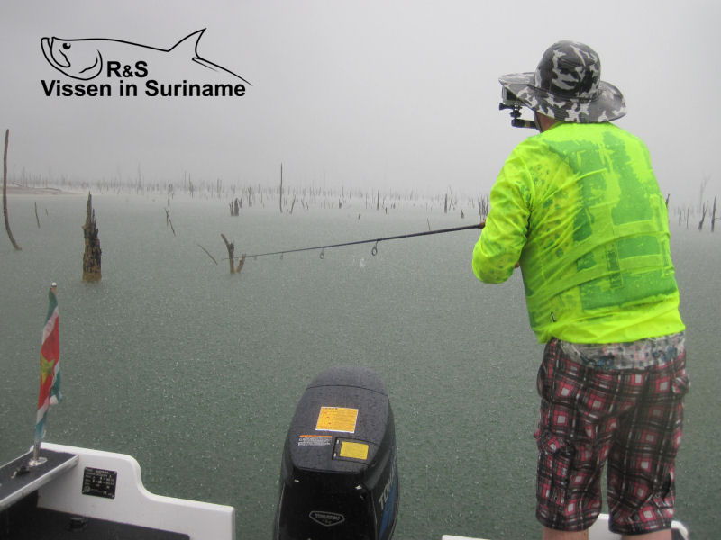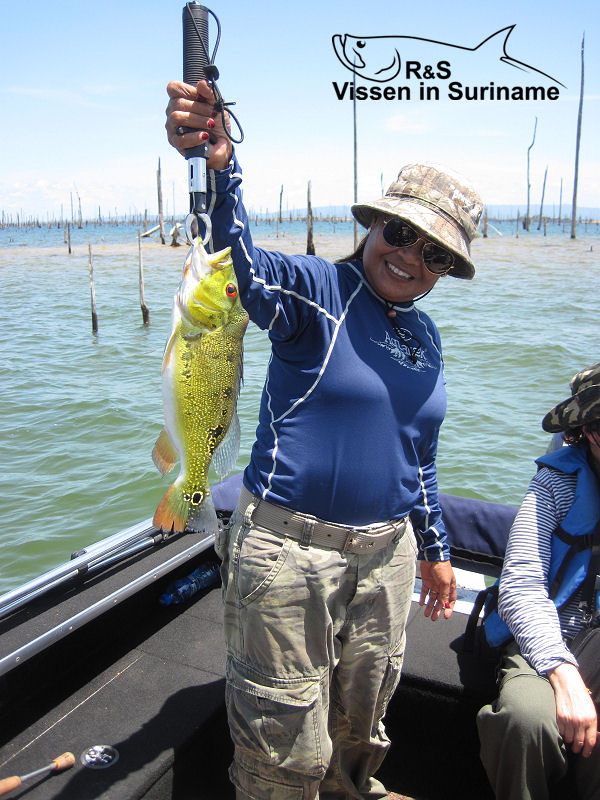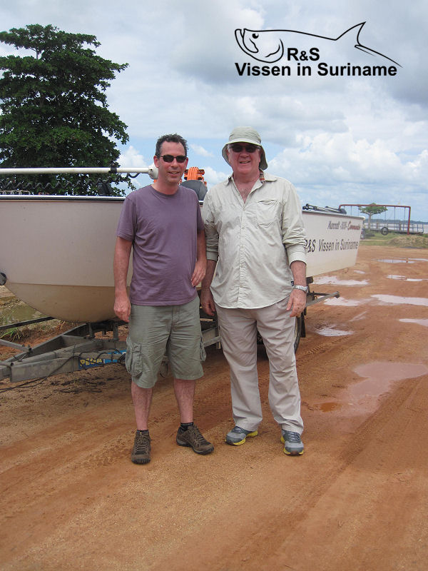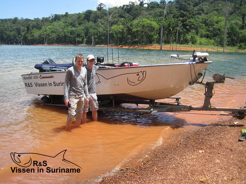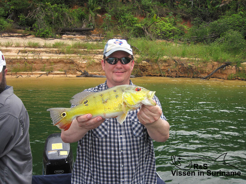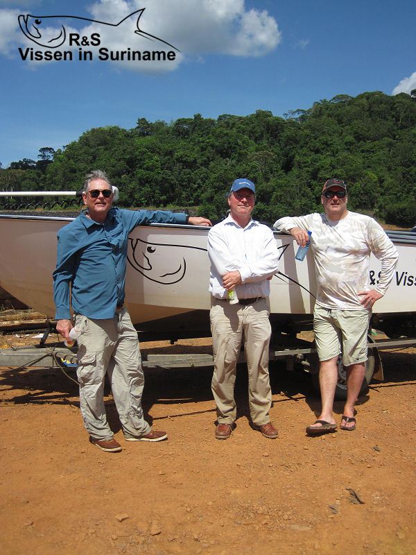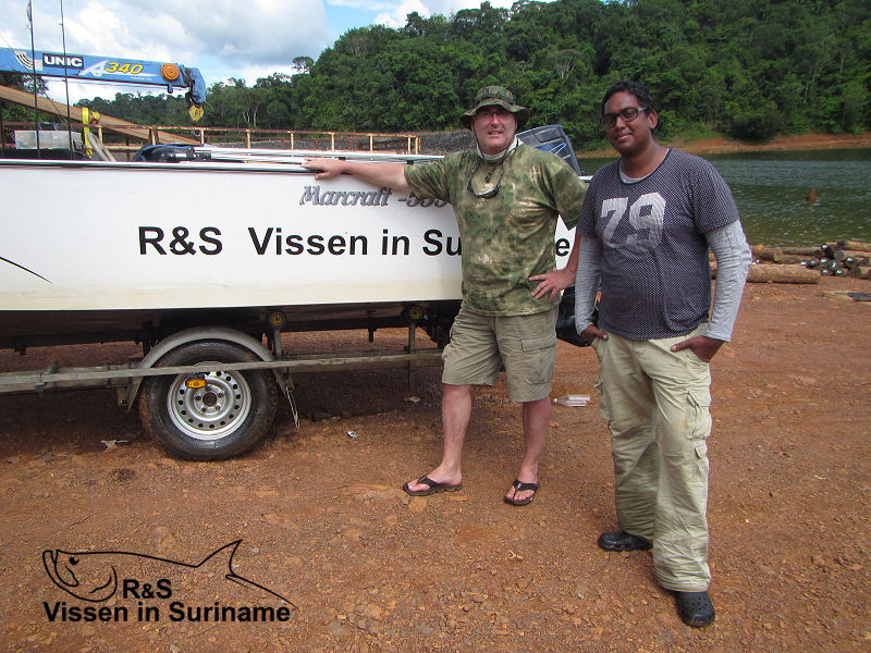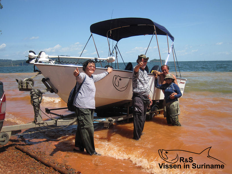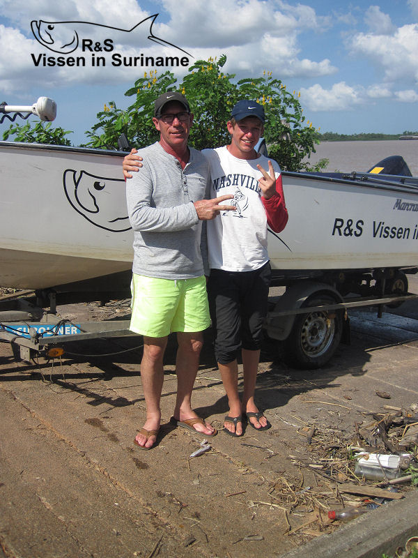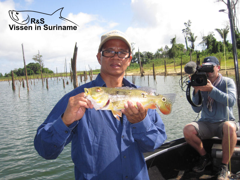 Ab de Jong en Peter Naarden plannen ver vooruit. Reeds een half jaar van de voren doen ze de reservering voor 3 dagen vissen op het Stuwmeer met overnachting op basic resort "Libidawai".. Het zijn ervaren vissers die over de hele wereld gevist hebben. Zowel met de vliegenlat als met de spinning reels. Belangrijk detail. Ab en Peter zijn 65+ en een stabiele visboot vinden ze erg belangrijk. Bij “R&S Vissen In Suriname” met de “Commander van Marcraft” zijn ze aan het juiste adres. Op dag 1 vertrekken we om 04.30 vanuit Paramaribo. Na het traileren zetten we koers richting Libi Da Wai. We gaan onze bagage afzetten en vervolgens vissen. Het blijkt allemaal makkelijker gezegd dan gedaan. Het water is zo laag dat het resort met de grootste moeite te bereiken is. Vorig jaar bij het eiland, legde ik mijn boot vast aan een boom en toen had ik nog 2 meter water onder de boot. Dezelfde boom staat nu op het droge z’n 20 meter vanaf de waterlijn.... eenmaal uitgeladen gaan we vissen. Het blijkt een taaie visdag te worden. Zowel in de ochtend als in de middag verraden de vissen zich niet. Het wordt veel werpen, ondertussen drift ik de boot langs de interessante stekken. En het heeft resultaat. Er komt Tukunari aan boord. Een midden maatje. De Tukunari is niet blij en springt zo uit de handen van Ab.