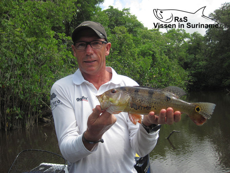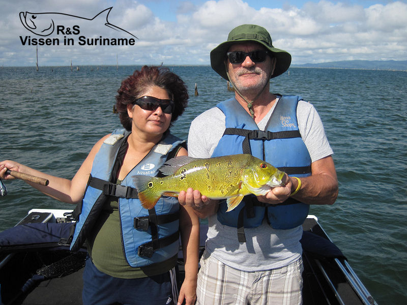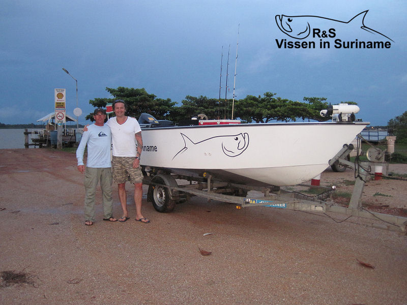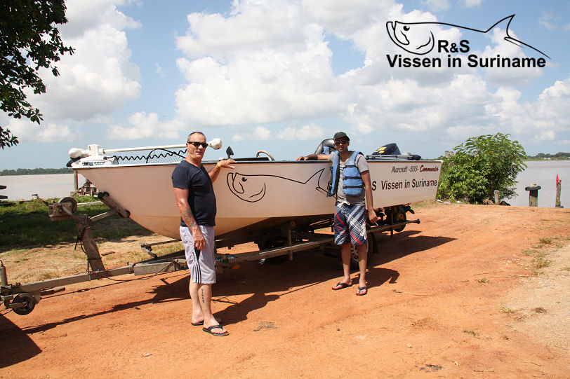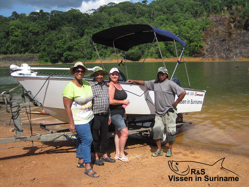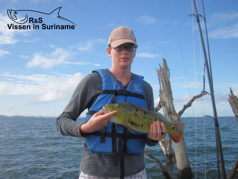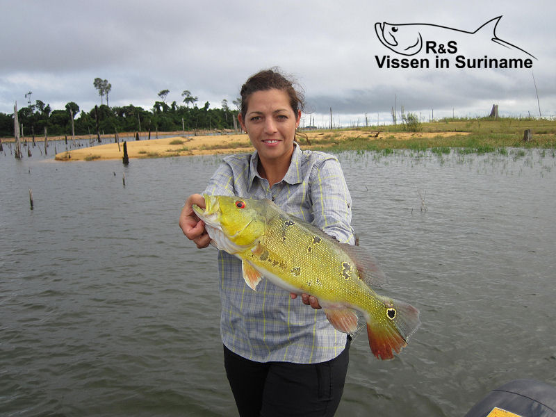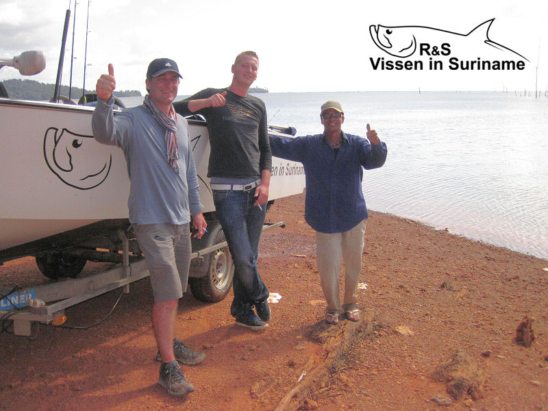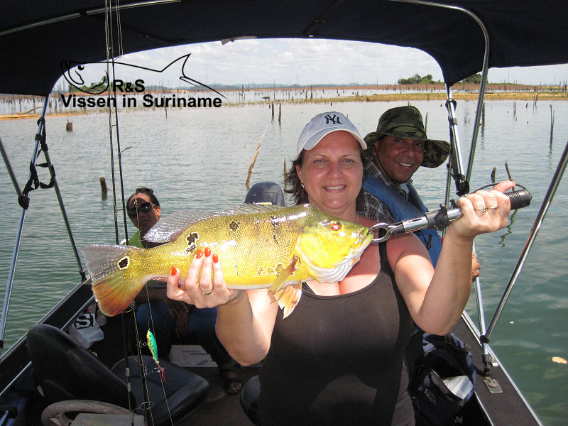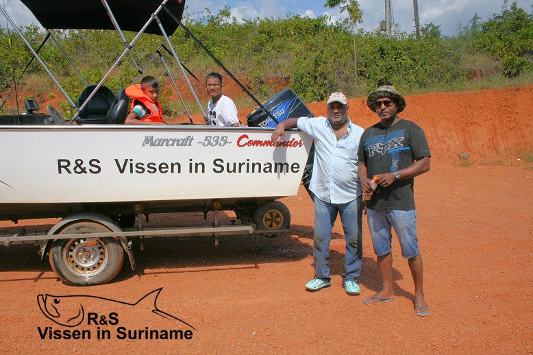 Ab de Jong en Peter Naarden plannen ver vooruit. Reeds een half jaar van de voren doen ze de reservering voor 3 dagen vissen op het Stuwmeer met overnachting op basic resort "Libidawai".. Het zijn ervaren vissers die over de hele wereld gevist hebben. Zowel met de vliegenlat als met de spinning reels. Belangrijk detail. Ab en Peter zijn 65+ en een stabiele visboot vinden ze erg belangrijk. Bij “R&S Vissen In Suriname” met de “Commander van Marcraft” zijn ze aan het juiste adres. Op dag 1 vertrekken we om 04.30 vanuit Paramaribo. Na het traileren zetten we koers richting Libi Da Wai. We gaan onze bagage afzetten en vervolgens vissen. Het blijkt allemaal makkelijker gezegd dan gedaan. Het water is zo laag dat het resort met de grootste moeite te bereiken is. Vorig jaar bij het eiland, legde ik mijn boot vast aan een boom en toen had ik nog 2 meter water onder de boot. Dezelfde boom staat nu op het droge z’n 20 meter vanaf de waterlijn.... eenmaal uitgeladen gaan we vissen. Het blijkt een taaie visdag te worden. Zowel in de ochtend als in de middag verraden de vissen zich niet. Het wordt veel werpen, ondertussen drift ik de boot langs de interessante stekken. En het heeft resultaat. Er komt Tukunari aan boord. Een midden maatje. De Tukunari is niet blij en springt zo uit de handen van Ab.