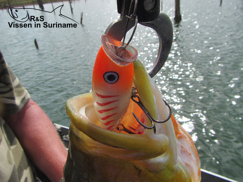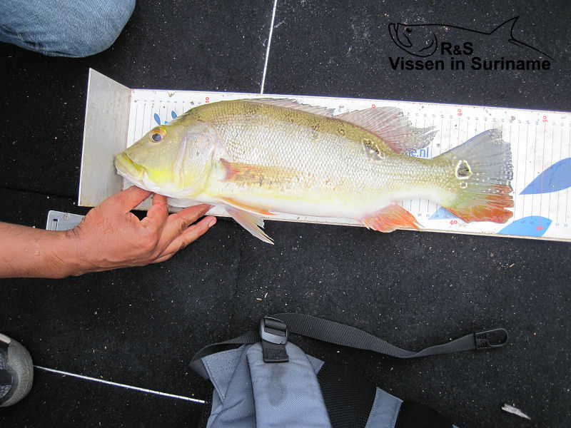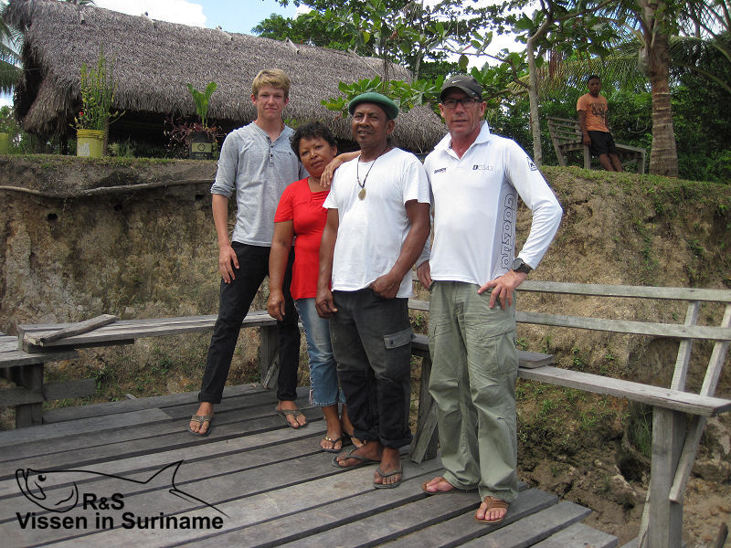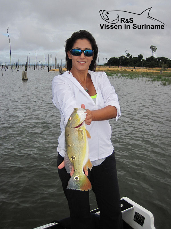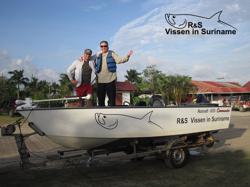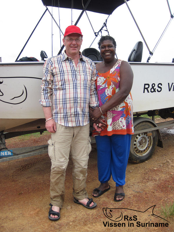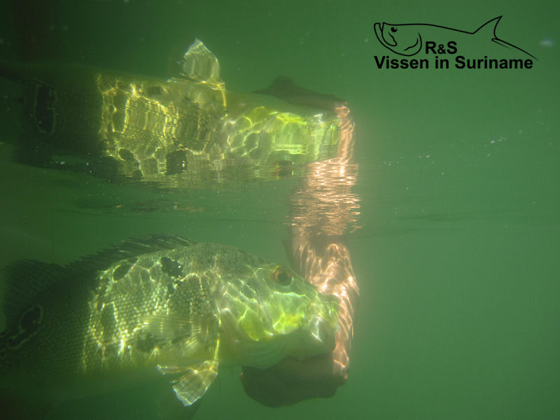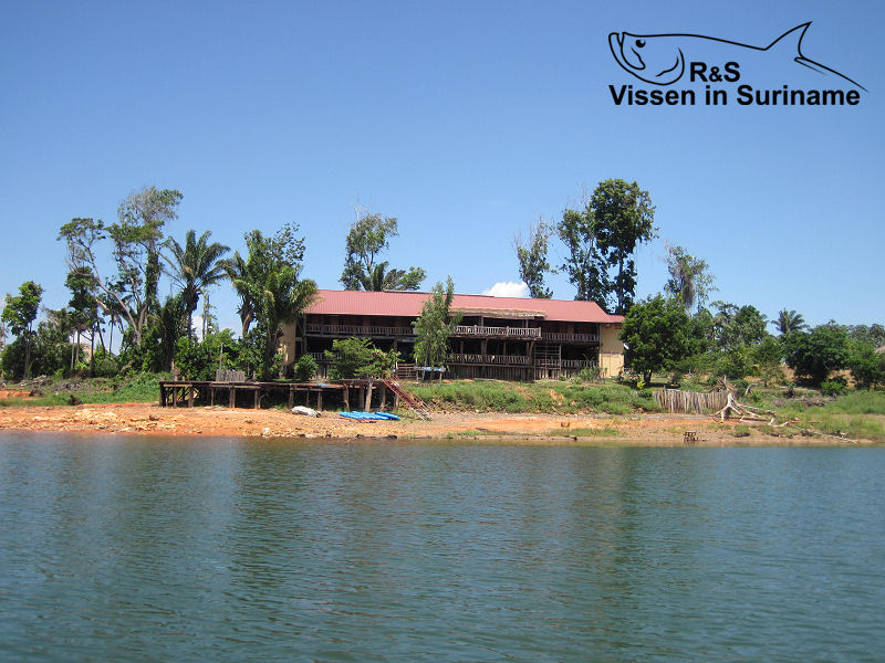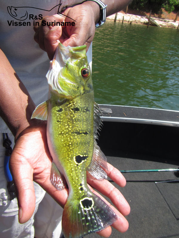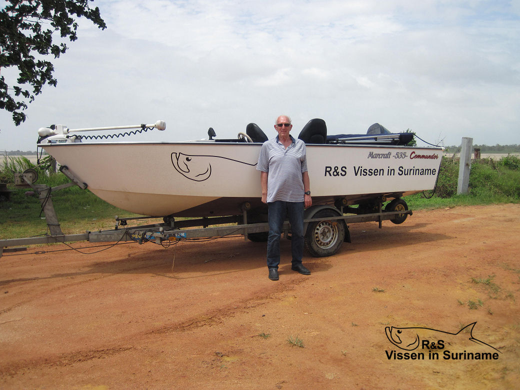 Ab de Jong en Peter Naarden plannen ver vooruit. Reeds een half jaar van de voren doen ze de reservering voor 3 dagen vissen op het Stuwmeer met overnachting op basic resort "Libidawai".. Het zijn ervaren vissers die over de hele wereld gevist hebben. Zowel met de vliegenlat als met de spinning reels. Belangrijk detail. Ab en Peter zijn 65+ en een stabiele visboot vinden ze erg belangrijk. Bij “R&S Vissen In Suriname” met de “Commander van Marcraft” zijn ze aan het juiste adres. Op dag 1 vertrekken we om 04.30 vanuit Paramaribo. Na het traileren zetten we koers richting Libi Da Wai. We gaan onze bagage afzetten en vervolgens vissen. Het blijkt allemaal makkelijker gezegd dan gedaan. Het water is zo laag dat het resort met de grootste moeite te bereiken is. Vorig jaar bij het eiland, legde ik mijn boot vast aan een boom en toen had ik nog 2 meter water onder de boot. Dezelfde boom staat nu op het droge z’n 20 meter vanaf de waterlijn.... eenmaal uitgeladen gaan we vissen. Het blijkt een taaie visdag te worden. Zowel in de ochtend als in de middag verraden de vissen zich niet. Het wordt veel werpen, ondertussen drift ik de boot langs de interessante stekken. En het heeft resultaat. Er komt Tukunari aan boord. Een midden maatje. De Tukunari is niet blij en springt zo uit de handen van Ab.