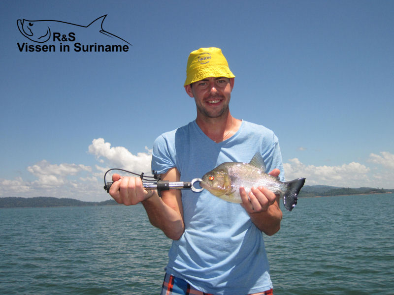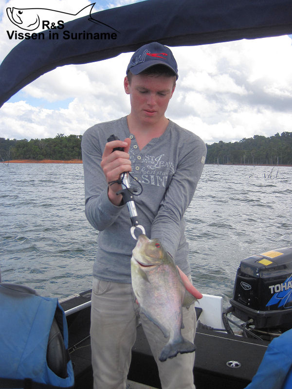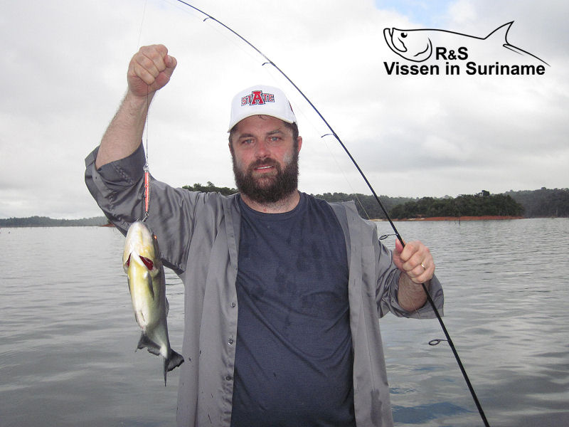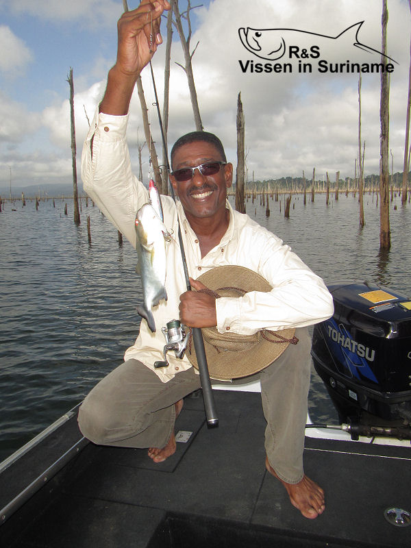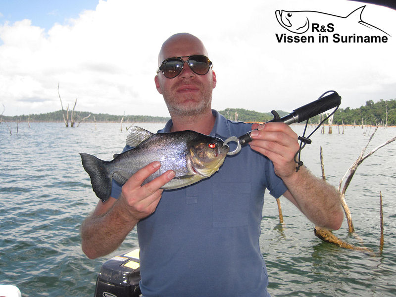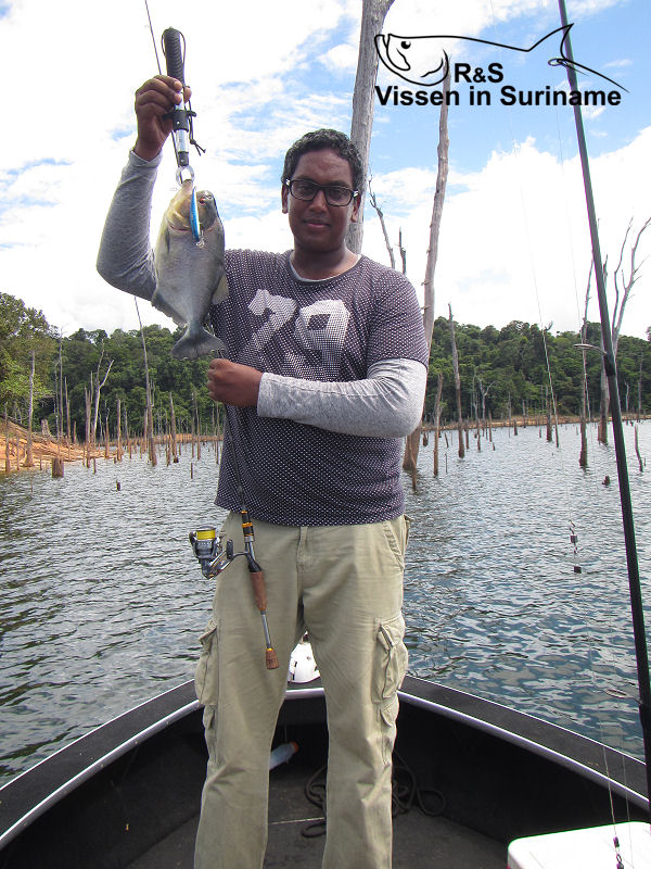 David Nieuwenhuis is Advocaat. Voor werk is hij 5 dagen in Suriname. De zaak loopt voorspoedig en zo komt het dat hij een paar dagen vrij te besteden heeft. Als sportvisser weet hij daar wel raad mee. Een Trip naar het Stuwmeer is snel geboekt. Ondanks de huidige (lage) waterstand blijft het stuwmeer een van de mooiste locaties om te vissen. Als ik om 04.30 voorrij komt David net het hotel uitlopen. 2 uren later zetten we, na het traileren, koers richting visgronden. Het is een mooie zonnige dag. Bij het eerste eiland spotten we actie. Al Driftend vissen we het eilandje af. Het duurt even maar dan meld de eerste Tukunari zich. Een Rapala Skitter Pop kon niet worden weerstaan. Na het meten en de foto gaat de vis retour. We driften verder... als we vlakbij een “bos” komen leg ik de boot vast. Voor ons een open plek waar zich onderwater een “berg” bevind. De Sonar geeft 5 meter diepte aan.. “perfect”.. Bij de 2de worp is het raak. Een enorme splash.. Een meter van de boot wordt de Rapala Skitter Prop van David gegrepen. Een leuke dril volgt. Davis smiled.. Z’n eerste Tukunari.... en er volgen meer... Ook Piranha staat op het verlanglijstje van David. Na het vangen van aasvisjes leggen we aan bij een grote boom. De sonar geeft 25 meter aan. Een dwarrellijntje, met livebait als aas, wordt langs de stam naar beneden gelaten. Een aanbeet volgt... tot onze verbazing komt er een Tukunari naar boven... Dat hadden we niet verwacht op 25 meter water. Uiteindelijk lukt het David om een aantal (Black) Piranha’s te vangen.