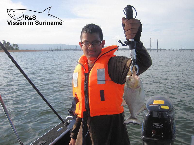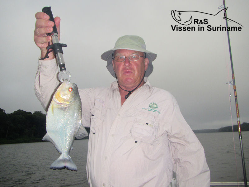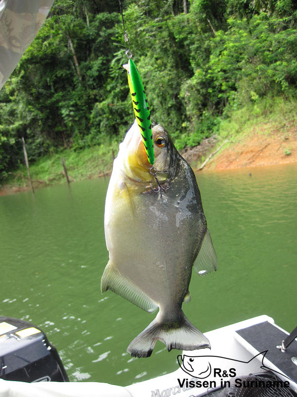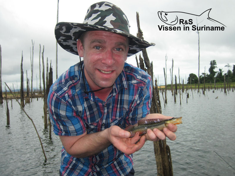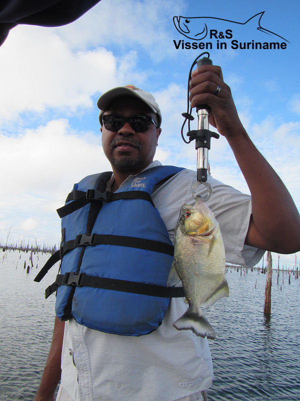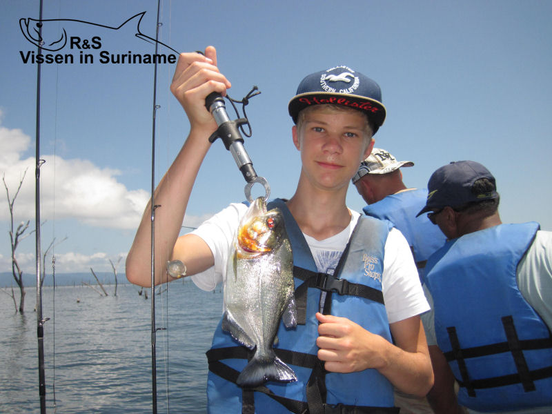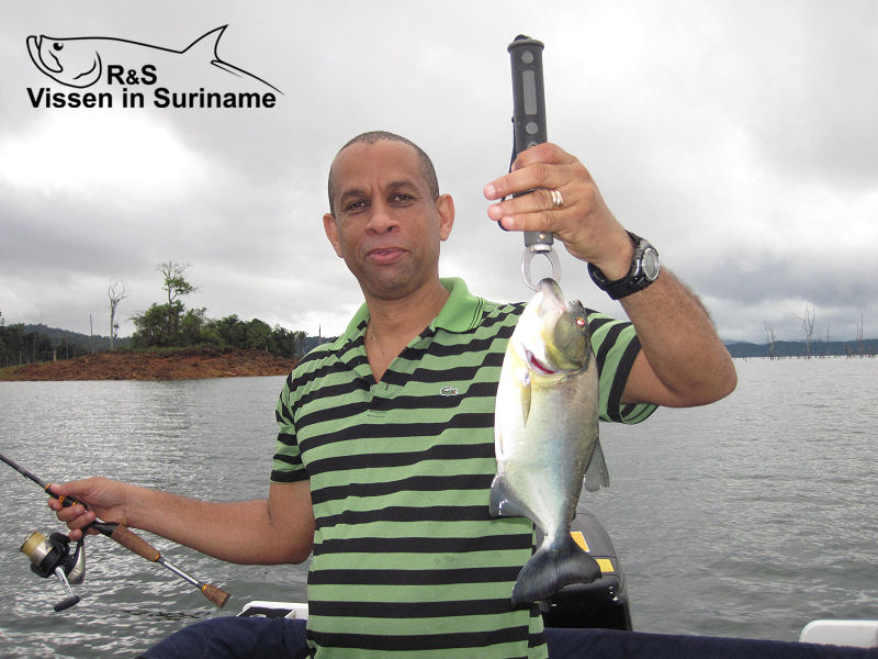 David Nieuwenhuis is Advocaat. Voor werk is hij 5 dagen in Suriname. De zaak loopt voorspoedig en zo komt het dat hij een paar dagen vrij te besteden heeft. Als sportvisser weet hij daar wel raad mee. Een Trip naar het Stuwmeer is snel geboekt. Ondanks de huidige (lage) waterstand blijft het stuwmeer een van de mooiste locaties om te vissen. Als ik om 04.30 voorrij komt David net het hotel uitlopen. 2 uren later zetten we, na het traileren, koers richting visgronden. Het is een mooie zonnige dag. Bij het eerste eiland spotten we actie. Al Driftend vissen we het eilandje af. Het duurt even maar dan meld de eerste Tukunari zich. Een Rapala Skitter Pop kon niet worden weerstaan. Na het meten en de foto gaat de vis retour. We driften verder... als we vlakbij een “bos” komen leg ik de boot vast. Voor ons een open plek waar zich onderwater een “berg” bevind. De Sonar geeft 5 meter diepte aan.. “perfect”.. Bij de 2de worp is het raak. Een enorme splash.. Een meter van de boot wordt de Rapala Skitter Prop van David gegrepen. Een leuke dril volgt. Davis smiled.. Z’n eerste Tukunari.... en er volgen meer... Ook Piranha staat op het verlanglijstje van David. Na het vangen van aasvisjes leggen we aan bij een grote boom. De sonar geeft 25 meter aan. Een dwarrellijntje, met livebait als aas, wordt langs de stam naar beneden gelaten. Een aanbeet volgt... tot onze verbazing komt er een Tukunari naar boven... Dat hadden we niet verwacht op 25 meter water. Uiteindelijk lukt het David om een aantal (Black) Piranha’s te vangen.