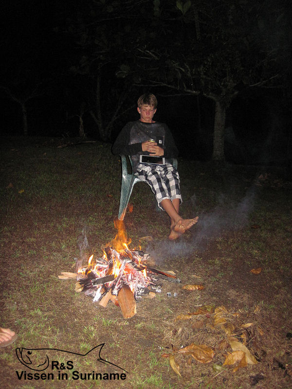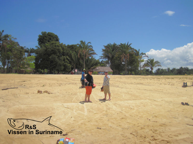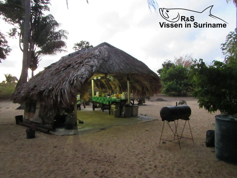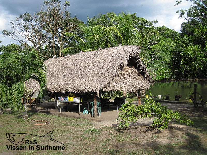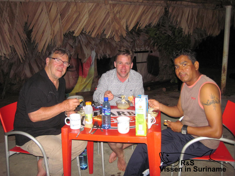 Henk en Rik vertrekken liever iets later zodat ze rustig kunnen ontbijten in het hotel. Om 10.00 zijn we bij de Stuwdam. Ik had al vernomen dat het water laag stond en het bleek nog verder gezakt te zijn..... het is wachten op de regentijd... Na het traileren zetten we koers richting het Resort “Libidawai”. Er is gekozen voor een “traditioneel” accomodatie, kamp met Pinabladerendak en basic sanitaire voorzieningen. Er is een badhok maar 90% van de gasten baad in het meer...In de middag beginnen we aan de eerste serieuze vissessie. Helaas zit het weer niet mee. Vissen doen we vanaf de kant. Voordat het donker wordt vangt Rik een grote piranha. En na een aantal missers weet ik een tukunari te haken.