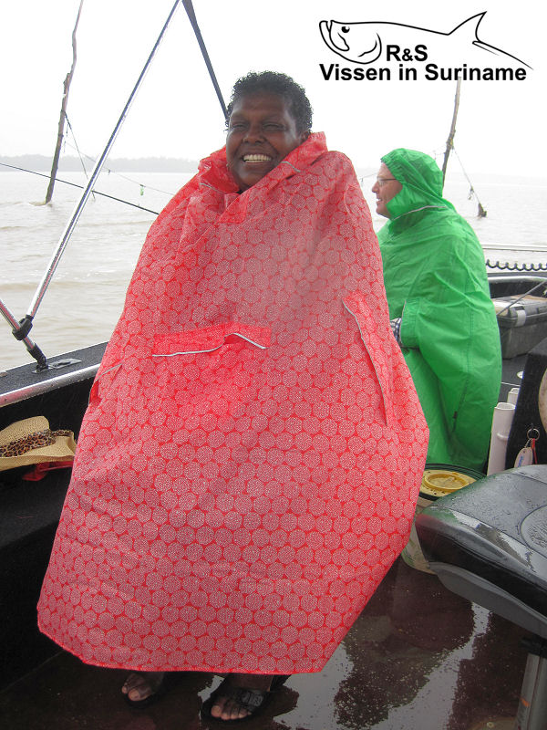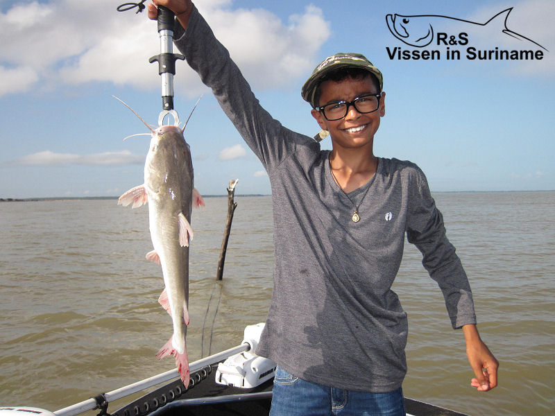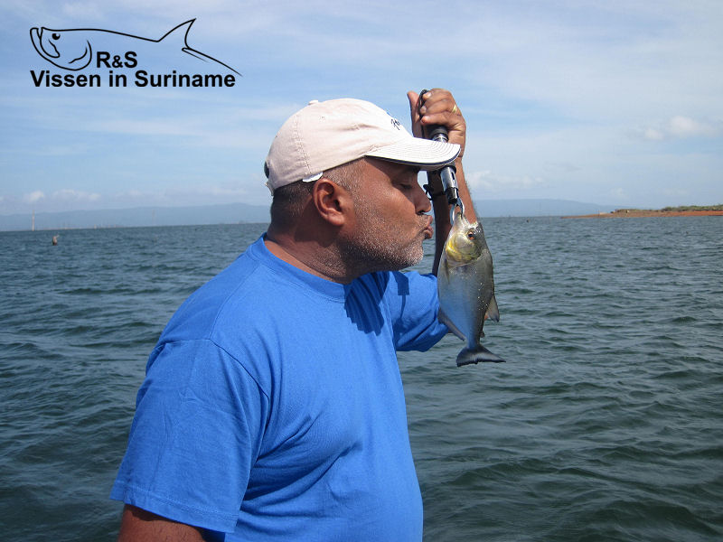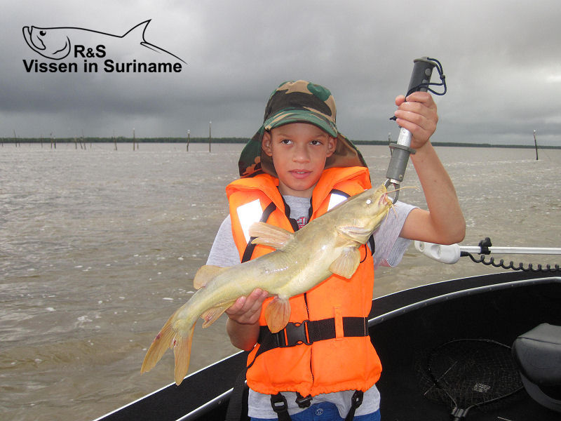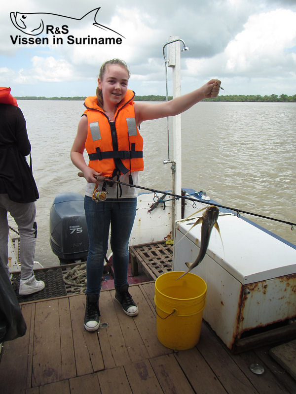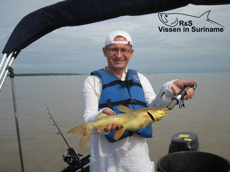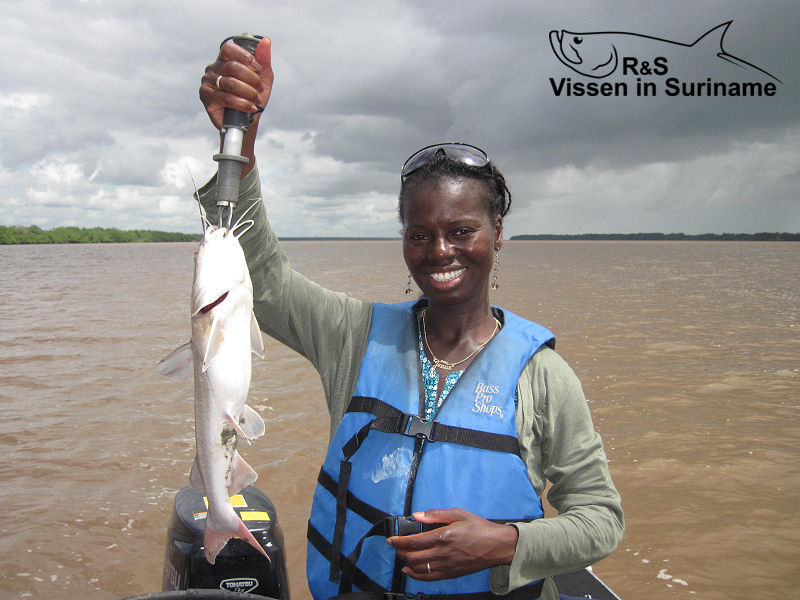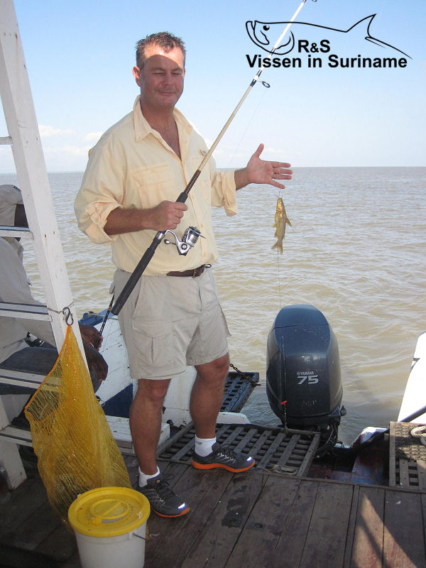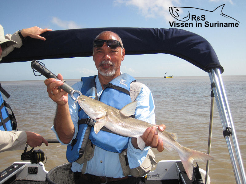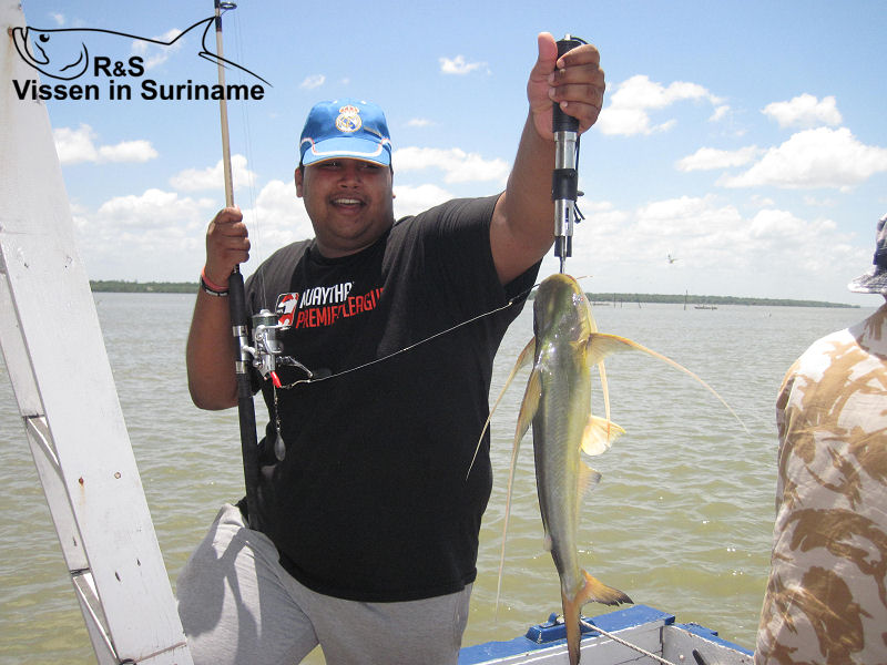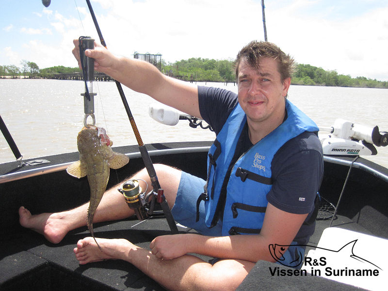 Als ik om 11.00 kom voorrijden staan Dig en Maikel al te wachten in de Loby van “hotel Palacio” (www.hotelpalacio.net). Dig woont op curacao en is een week op vakantie. Maikel woont sinds enkele jaren in Suriname mede door het succes met Compusur (www.compusur.sr). Dig is de ervaren visser. Maikel heeft nog nooit iets gevangen. Laatste poging om iets te vangen is nog geen week geleden. Toen heeft hij het 3 uren volgehouden in een poging om piranha te vangen. Vandaag moet het dan gebeuren.. Op naar de monding.... Dig laat zien dat hij de ervaren man is en begint gelijk met vis vangen. Een Kodokoe (Arius Quadriscutis). Het is een hele school, zelfde maat, zelfde soort. Ook maikel vangt er een paar. We besluiten te verkassen. En dan begint het bij Maikel.. Hij neemt het stokje over van Dig en vangt eerst een Koema Koema (Arius Couma) van 73 cm. En niet lang daarna een Lompoe (Batrachoides Surinamensis) van 3 kilo. (lengte niet gemeten). Als afsluiter vangt Dig nog een Bosrokomang (Blowfish). Al met al een leuke dag, ook de dolfijnen waren aanwezig, helaas geen roggen gezien. Ondanks de bewolking en regenbuien is het aardig gelukt om hier tussendoor te varen.