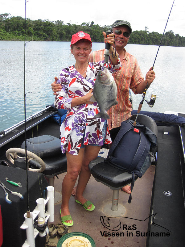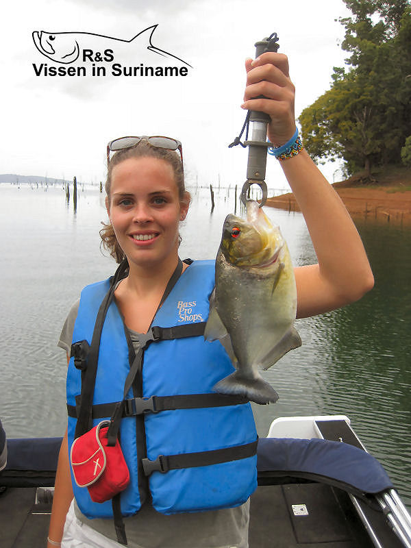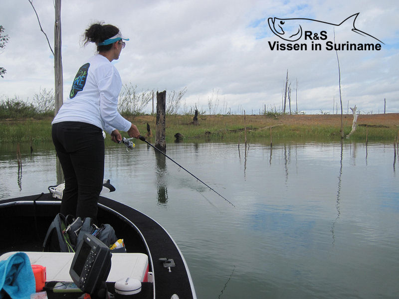 Als ik om 04.00 kom voorrijden staan Baukje en Tjalling al gereed. Een kleine 2 uur later zijn we bij de helling. Het weer zit niet mee en het water staat erg laag. Na het traileren en een uurtje varen zijn we op de eerste vislocatie. Ondanks de bewolking hebben we een leuke start. Tjalling gaat direct aan de slag. Na instructies begint ook Baukje te vissen. Driftend gaan we opzoek naar de Tukunari (Cichla Ocellaris). Binnen 10 minuten heeft Tjalling de eerste aanbeet.. Hij is onder de indruk van de aanbeet & de dril en smiled.. Vlak voor de boot sputterd de Tukunari nogmaals tegen en lost het aas... Jammer.. maar ook van de missers wordt genoten. Dat is het mooie van vissen met oppervlakte kunstaas. Gelukkig duurd het niet lang of de eerste vis wordt geland. Een Piranha (Serrasalmus rhombeus).. en ook Tukunari laat zich zien.. Inmiddels begint baukje het werpen steeds beter onder de knie te krijgen. Maar de bewolking begint ons parten te spelen. De Tukunari, een echte zicht rover, houd van mooie helder weer. Na het lunchen, verkassen we naar de andere kant van het meer. En hier gaat het los.. helaas is het Piranha dat de klok slaat. En Baukje weet ze te vinden....