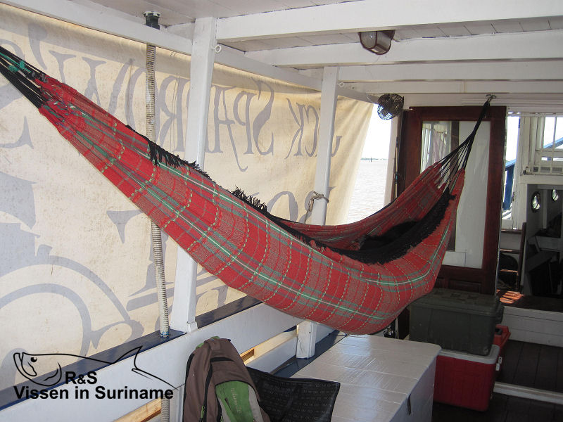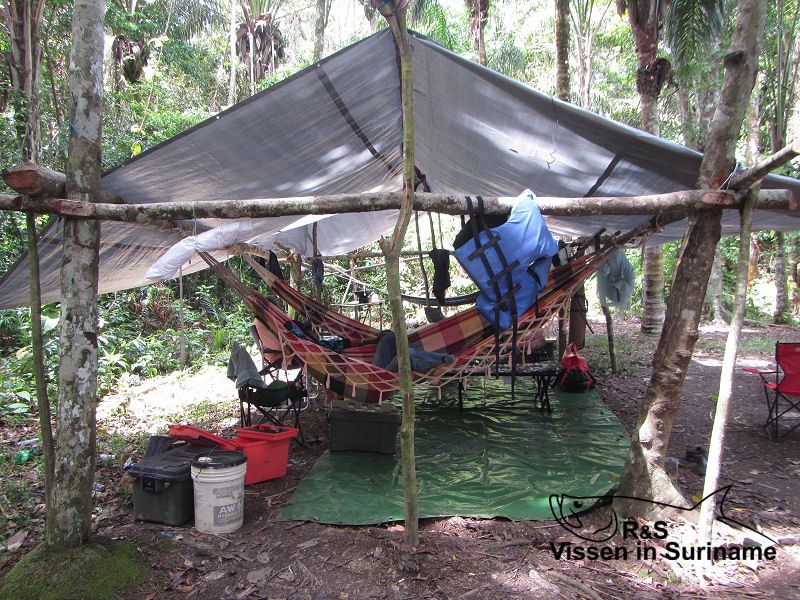 De 2de meerdaagsetrip van Ab de Jong en Peter Naarden gaat naar de Coppename/ Wayambo. Dit keer slapen we in het bos. Robby (kok) en Romario (lokale gids) zullen ons vergezellen. Om 04.00 vertrekken we vanuit Paramaribo. Als we bij de trailerhelling aankomen, begint het licht te worden. Het tij is al gekeerd. Met de grootste spoed maken we de boot vaarklaar en traileren maar. Op z’n “natuurlijke” trailerhelling voel ik me pas gerust als de boot te water is. Ondanks de zware belading varen we in 1,5 uur over de Coppename naar de Wayambo rivier. Als accomodatie maken we gebruik van een bestaande jagers kamp. Dit is niets meer als een frame van boomstammen waar we alleen nog maar een dekzeil overheen hoeven te trekken. Slapen in hangmatten of op stretchers. Als het kamp eenmaal staat, kan het vissen beginnen. Het begint rustig.. als we terug zijn voor de lunch staat de teller nog op nul... Gelukkig heeft de kok gezorgd voor een Hindoestaanse maaltijd (Roti kip aardappel kouseband)..... hhmm het smaakt goed. Na z’n maaltijd valt niet te ontkomen aan een middagdutje.. s’middags zorgt Romario voor vers aas (vis). Daarna gaan we op jacht naar de Lalau. Op de monding van de Wayambo in de Coppename gaan we voor anker. Wederom blijkt het een taaie visserij te zijn. Helaas wordt een aanbeet gemist en ondanks het aantal keren verkassen, komt er geen beweging meer op de toppen. Eenmaal terug in het kamp worden we verwent met een kom Sautosoep...