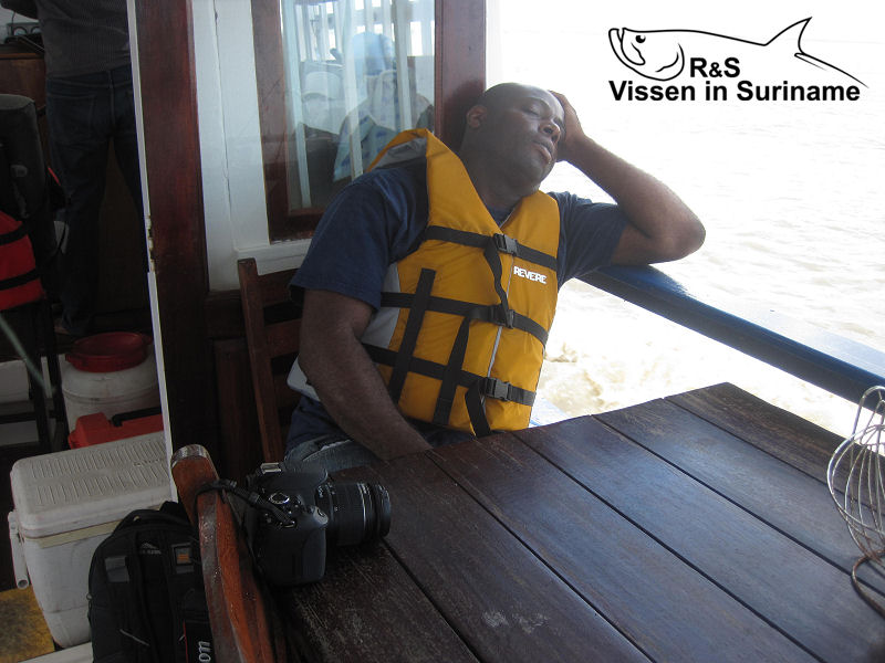 Gisteren naar het Meer, vandaag naar de Monding. Tetsuya heeft er zin in. Eenmaal op het water blijken er weinig beroepsvissers(fuikvissers) actief te zijn. Bij Braamspunt beginnen we te vissen met aas uit de vriezer. De aanbeten laten niet op zich wachten, vrij snel land Tetsuya zijn eerste meerval, een kodokoe. Als een van de fuikvissers heeft opgeruimt komt hij langszij varen en ruil ik een koude cola tegen wat aas. Een goed moment om te verkassen. Voor het dorpje Pomona leg ik de boot vast in de buurt van een fuikvisser. Hier hebben we even tijd om wat te eten. De “lunchbox” is nog niet weg of Tetsuya krijgt een run op zijn hengel… een mooie Kati is zijn deel.. er komen nog een aantal kleine meervallen aanboord. Dan een RUN op de medium hengel…Tetsuya kan aan de bak… een Rog.. plakken aan de bodem… na een minuut of 15 stel ik voor de boot los te gooien maar Tetsuya wil de vis “zelf” naar binnen halen. Het is een strijd tegen vis & stroming. Na nog eens 15 minuten is Tetsuya kapot. En mijnsinziens duurt de dril nu te lang wat niet goed is voor de vis. De boot wordt losgegooid. Nu de stroming “wegvalt” geeft de vis zich snel gewonnen. Een mooie rog met een schilddoorsnede van 94cm.. Als we weer aangelegd hebben vallen de aanbeten weg. Het is lang wachten en de vermoeidheid slaat toe, Tetsuya doet een dutje..