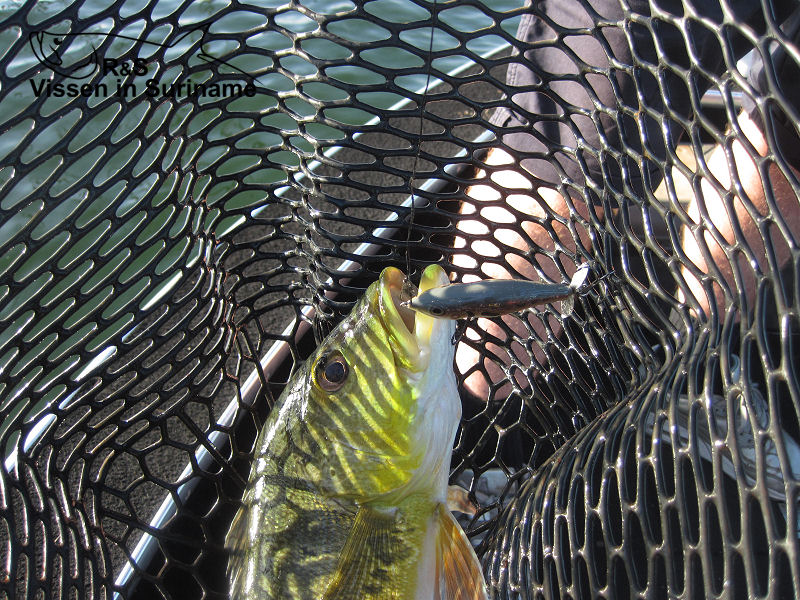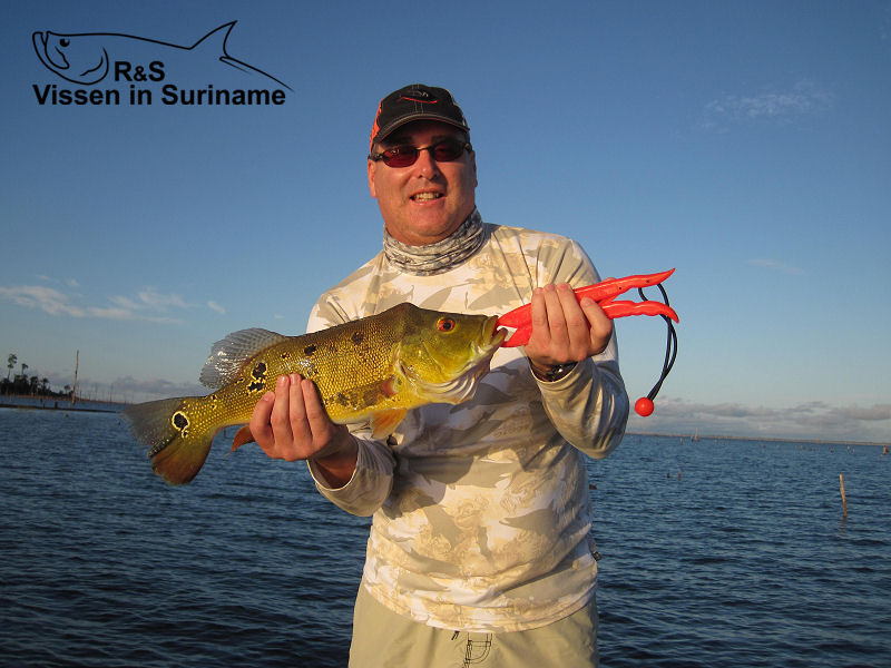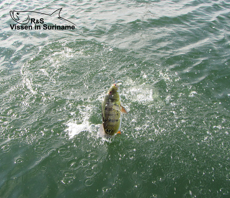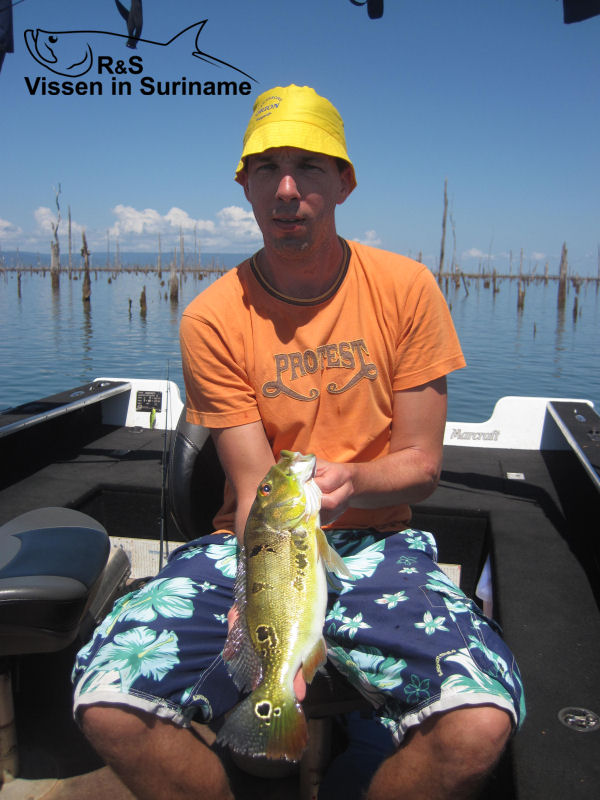 De volgende dag zijn we voor dag & dauw op. De kok heeft voor het ontbijt gezorgd en zodra het licht wordt gaan we het water op. Na anderhalfuur varen zijn we halverwege het meer. Hier moet het gaan gebeuren. Er wordt gevist met poppers, Subwalks en duikers. Er volgen aanbeten. Er wordt vis gehaakt.. een Piranha... en een bijzondere vangst, een Datrafisie (Crenicichla Saxatillis)... een aantal Tukunari’s worden gehaakt maar ook weer gelost.. het zit niet mee. Bij 1 losser kan je nog genieten van de aanbeet en de dril. Maar na 3 lossers wil je Tukunari in de boot. Rik geeft het niet op, terwijl ik terugvaar naar de “vaarroute” vist hij fanatiek door. HOOO... WACHT.. STOP.. BEET....Mag ik deze nog binnenhalen?? gilt hij. Een vis heeft de dieplopende Arukushad van Spro gepakt. Ik pak het schepnet en twijfel...een piranha ga ik niet scheppen want die bijt het net kapot.... Yes een dikke Tukunari komt naar boven, doet nog een poging de haak te lossen door een aantal salto’s door de lucht te maken.... en...in het netje.. YES YES YES.. het is een mooie, 42CM op de meetlat. Voldaan varen we terug naar het resort.