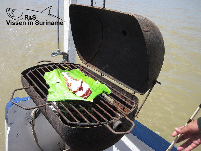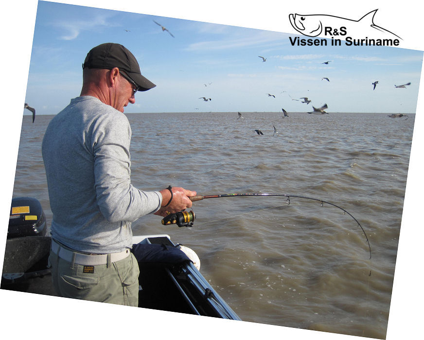 Charles is goed voorbereid. Heeft zijn (tarpoon)materiaal bij zich. Reeds op verschillende locaties heeft hij tarpoon gevangen. Zoals Nickerie (sur), Curacao, Bonaire enz. Ik zorg voor vers aas in de vorm van levende garnalen en sriba’s (visjes). Na 1.5 uur varen zijn we op locatie, een mooie 3-sprong op de cottica. .. het is een indrukwekkende natuur.. Hier moet het gaan gebeuren. Met kunstaas beginnen we al driftend de kreek af te vissen. Duikers, popers en live bait gaan te water. De mondingen van kleine stroompje worden uitgevist. Fernando heeft een aanbeet.. MIS.. verder is er geen activiteit op de kreek. We besluiten terug te gaan naar de 3-sprong. De fishfinder slaat uit.. er is voldoende vis aanwezig. Na de lunch vissen we de 3-sprong af. Er wordt gevist, passief op de bodem en met een ballon, driftend op de wind & stroming.... Charles heeft een Visual van een Tarpoon. En het lukt om de ballon in zijn omgeving te krijgen. We zitten in spanning te wachten wat komen gaat......